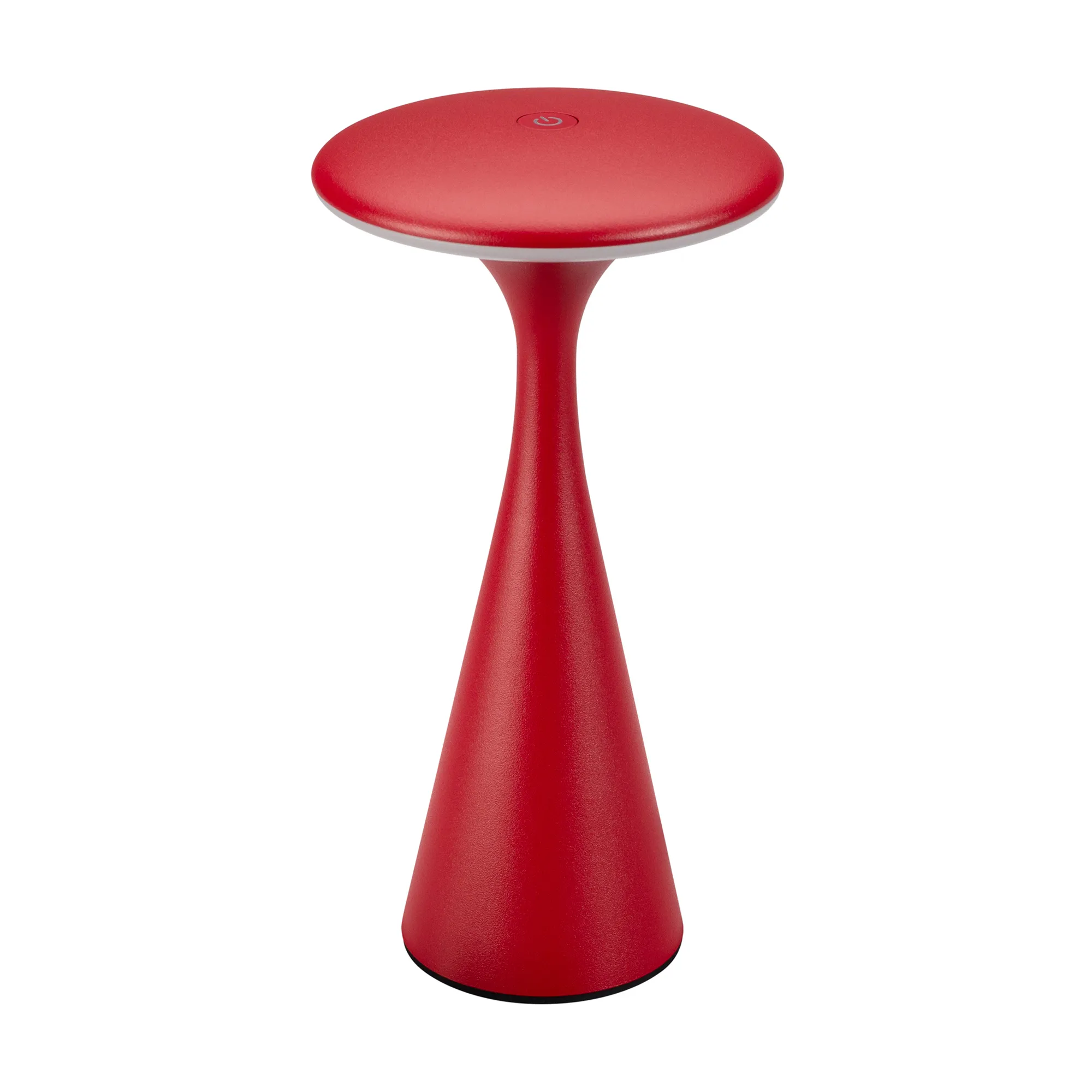 Настольный светильник со встроенным аккумулятором 1.5Вт, красный алюминиевый корпус. Цвет ТЕПЛЫЙ БЕЛЫЙ 2200-3000K, св.поток 110лм, CRI(Ra)>80, угол 123°. Размер Ф101x197мм. IP54. Зарядка от сети переменного тока AC220-240V. Тип встроенного аккумулятора 2600мАч Li-ion, напряжение батареи 3.7V