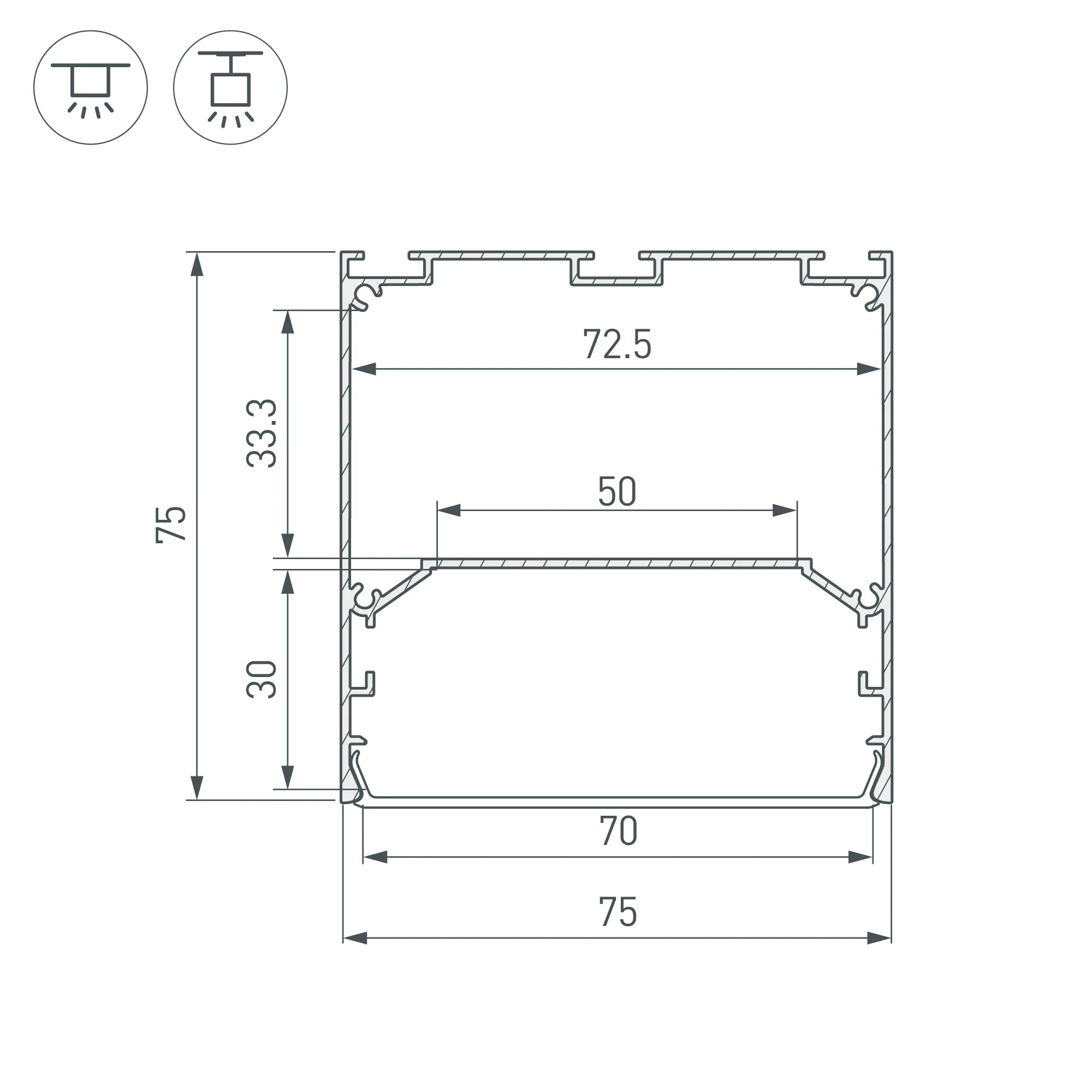 Алюминиевый профиль для светодиодных лент и линеек. Цвет - черный RAL9005 (порошковая окраска). Габаритные размеры (L×W×H): 2000x75x75 мм. Ширина площадки для ленты 50 мм. Отсек для БП 72,5х33,3 мм. Экраны, заглушки и другие аксессуары приобретаются отдельно. Цена за 1 метр.