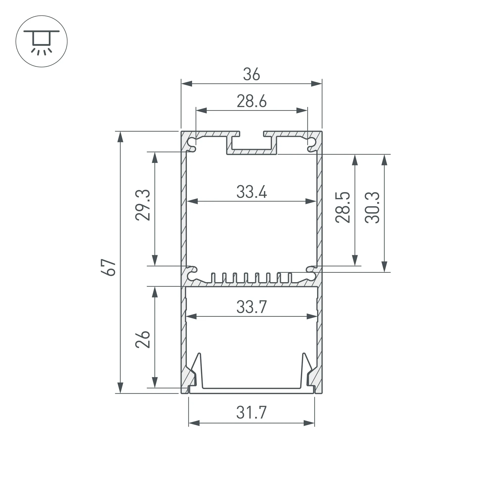 Алюминиевый анодированный профиль для светодиодных лент и линеек. Габаритные размеры (L×W×H): 2000x35x67 мм. Ширина площадки для ленты 33 мм. Отсек для БП 32х29мм. Экраны, заглушки и другие аксессуары приобретаются отдельно. Цена за 1 метр.