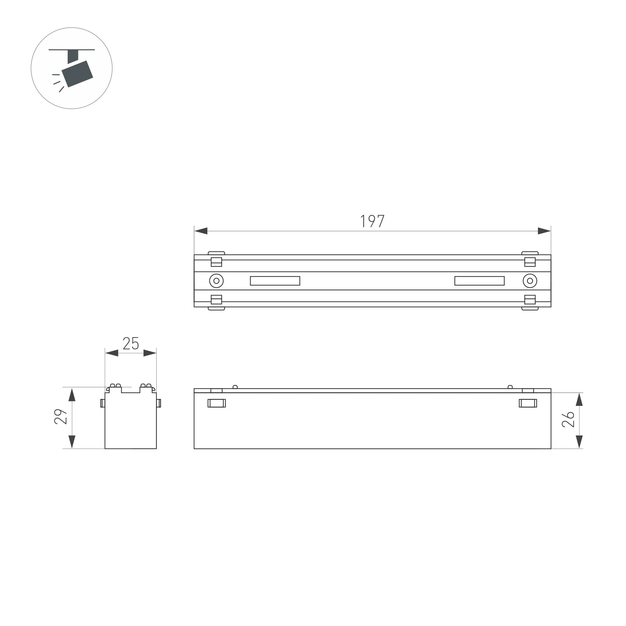 Светильник для магнитных треков MAG-VIBE. Мощность 12 Вт, св. поток 890 лм, 74 лм/Вт, теплый 3000 K, CRI>90, угол 24°, напряжение питания 48 В. Белый прямоугольный корпус из алюминия, экран поликарбонат, степень защиты IP20. Размер: длина 197 мм, ширина 25 мм, высота 29 мм. Монтаж на трек MAG-VIBE. Пульсация <1%.