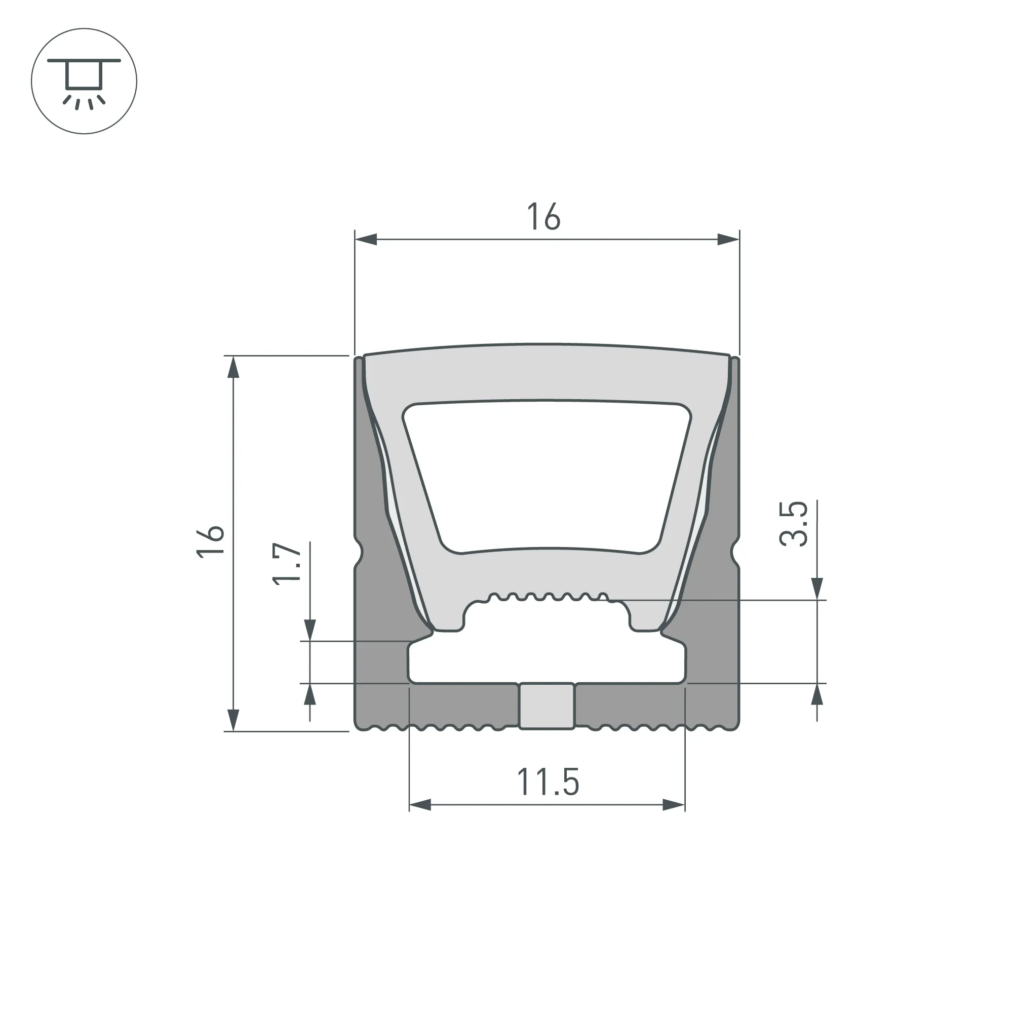 Цельнолитой силиконовый гибкий профиль, верхняя часть - белая матовая, остальные стороны - черные матовые. Габаритные размеры 5000×16×16 мм. Вертикальный изгиб TOP, минимальный радиус изгиба 60 мм. Для установки во влажных помещениях необходима герметизация при помощи двухкомпонентного эпоксидного герметика. Класс пылевлагозащиты – IP65 (при соблюдении технологии герметизации). Для лент шириной 10 мм, высотой до 2,85 мм и мощностью до 10 Вт/м. При подборе ленты необходимо учитывать, что втяжка лент COB, герметичных лент и лент с наличием силиконового слоя может быть затруднена. Угол излучения 110°. Поставляется в катушках по 5 м. Цена за 1 м.