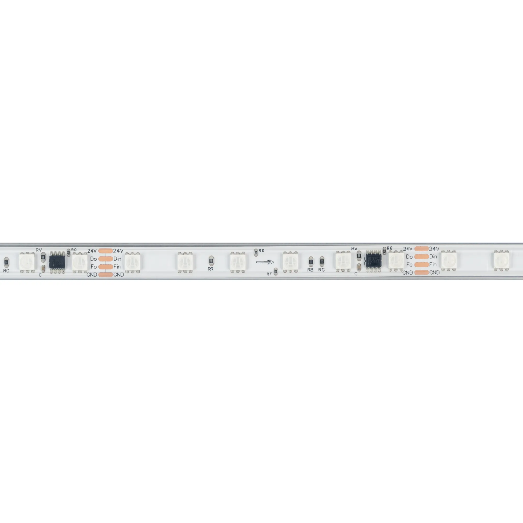 Светодиодная герметичная лента SPI серии B60 с микросхемой MT1808A, IP67 (PS - силиконовая экструзия). Светодиоды SMD 5060, 60 шт/м, 10 pixels на 1 м (50 pixels на 5 м), 1 pixel = 6 светодиодов, белая плата шириной 10 мм, скотч 3М. Цвет RGB, угол 120°. Питание 24 В, мощность 12 Вт/м (60 Вт на 5 м). Размеры 5000x12x5 мм. Мин. отрезок 100 мм, 6 светодиодов. Цена за 1 м.