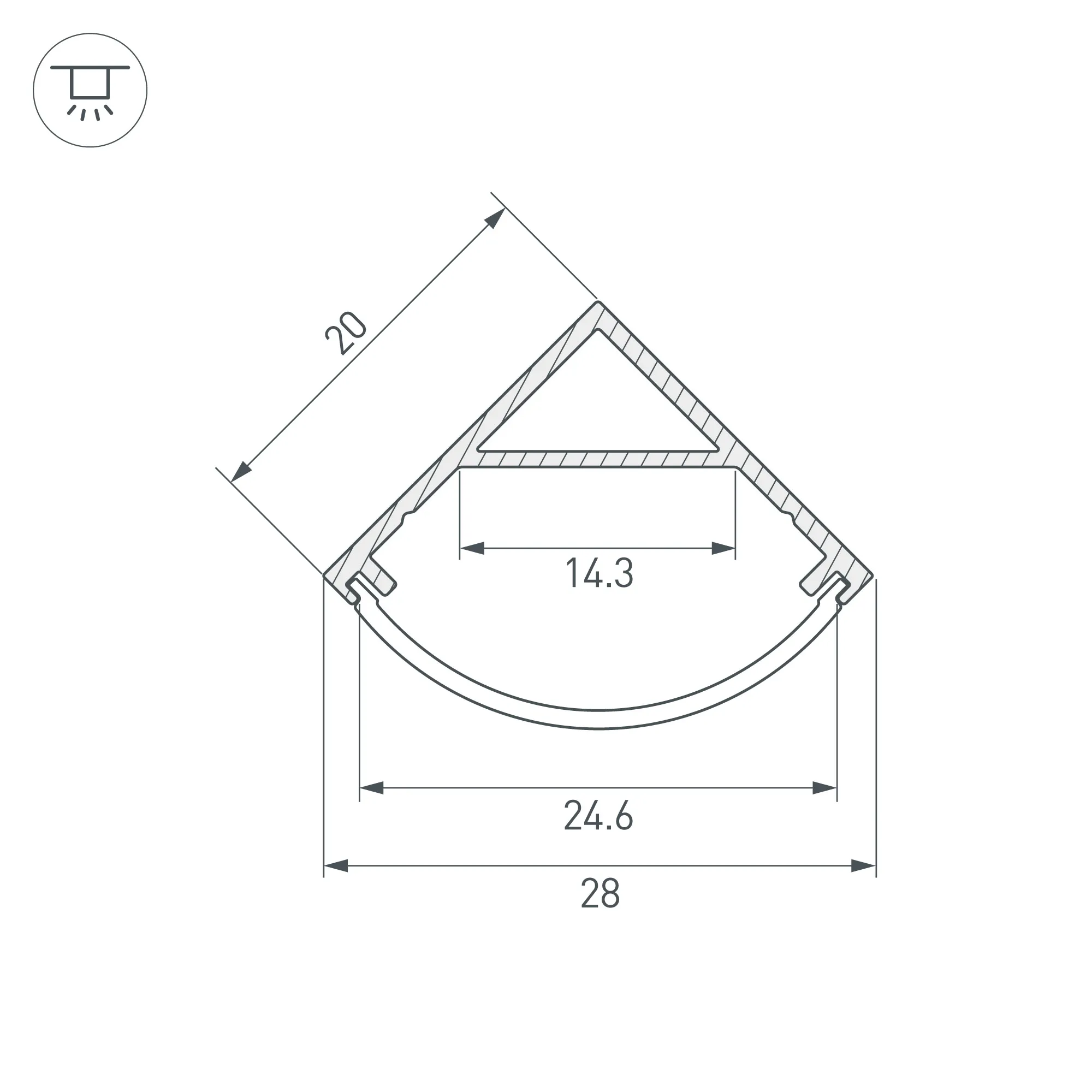 Алюминиевый анодированный угловой профиль для светодиодных лент и линеек. Габаритные размеры (L×W×H): 2000x20x20 мм. Ширина площадки для ленты 14,3 мм. Экраны, заглушки и другие аксессуары приобретаются отдельно. Цена за 1 метр.