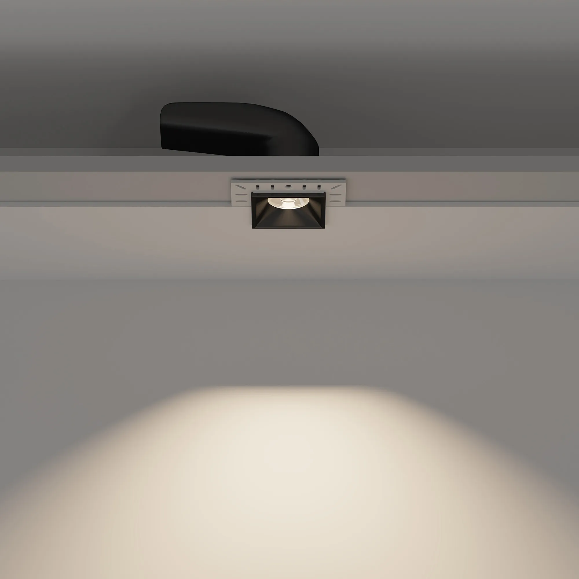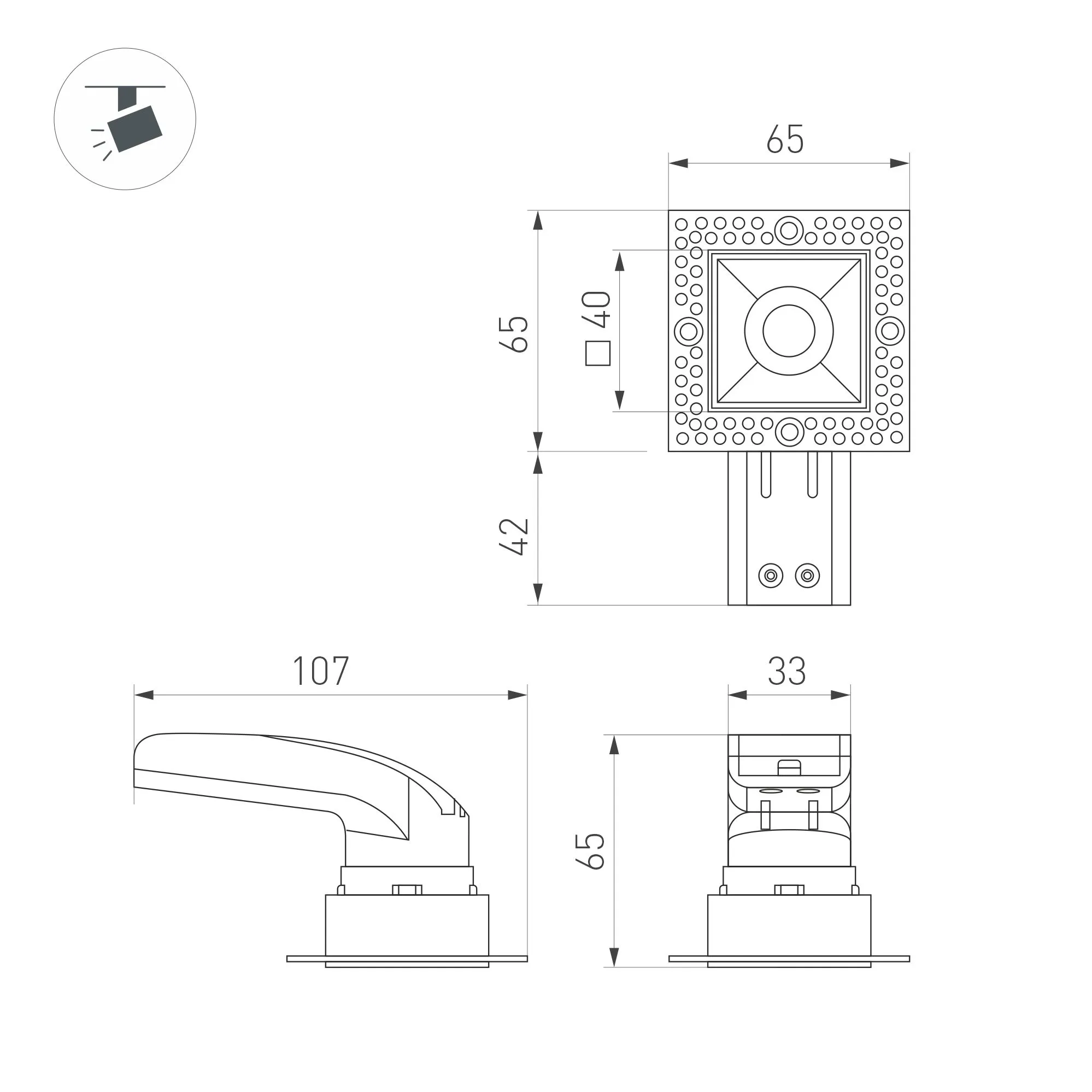 Встраиваемый безрамочный светильник под шпаклевку. Мощность 9 Вт, св. поток 700 лм, 78 лм/Вт, дневной 4000 K, CRI>90, угол 36°, напряжение питания 230 В. Чёрный квадратный корпус, экран PMMA, степень защиты IP20. Размер: длина 65 мм, ширина 65 мм, высота 63 мм, размер отражателя 40x40 мм. Монтаж встраиваемый, установочное отверстие длина 45 мм, ширина 45 мм. Драйвер 26-40 В, 200 мА, пульсация <2%.
