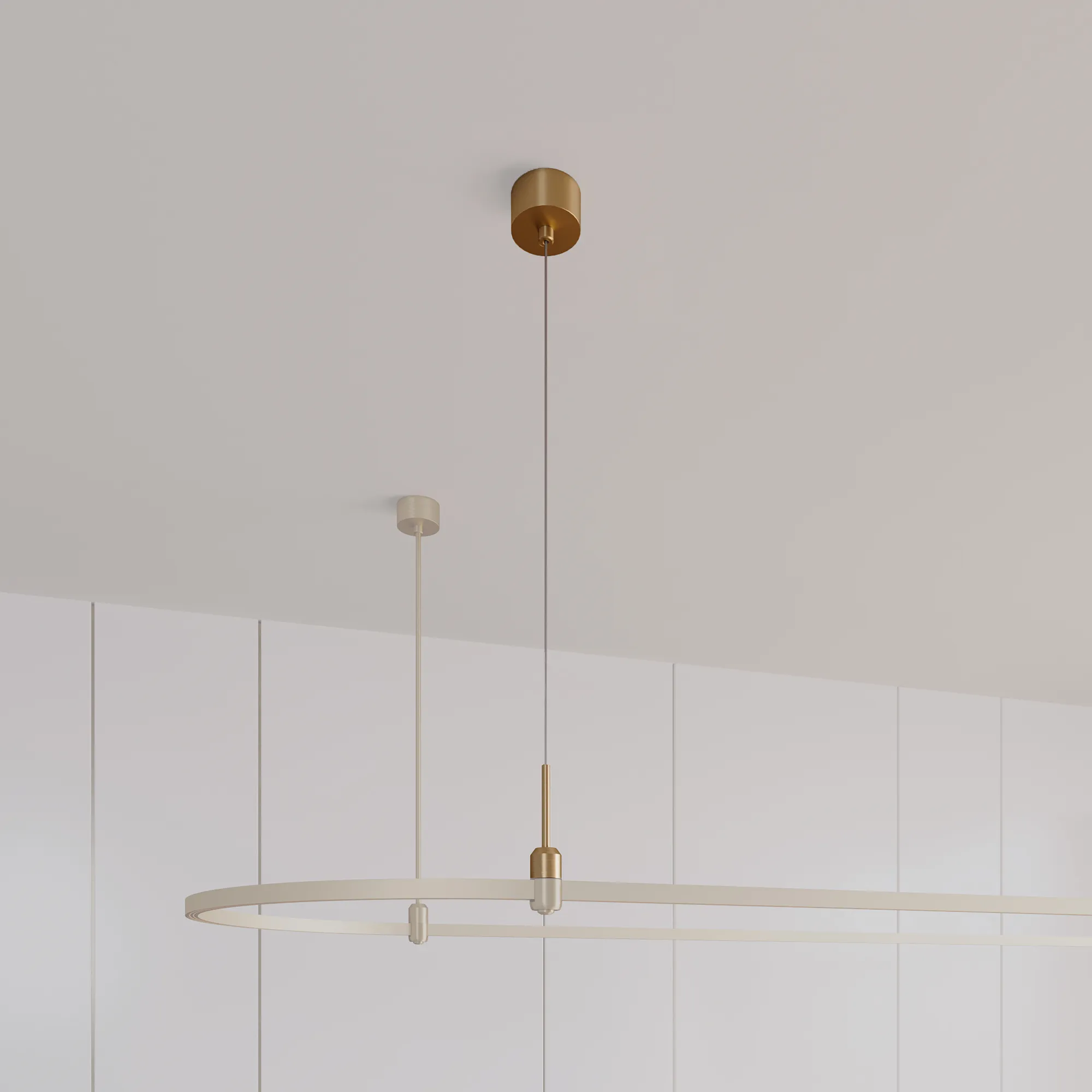 Подвес с прямым подводом питания для крепления к поверхности треков системы APRIORI. Тип крепления A. Диаметр чаши 80 мм, внутренний диаметр чаши 74мм, внешняя высота чаши 38 мм, глубина чаши до монтажного отверстия 25 мм, общая высота подвеса 5000 мм. Материал алюминий, цвет светлое золото. Выдерживает вес 20 кг.