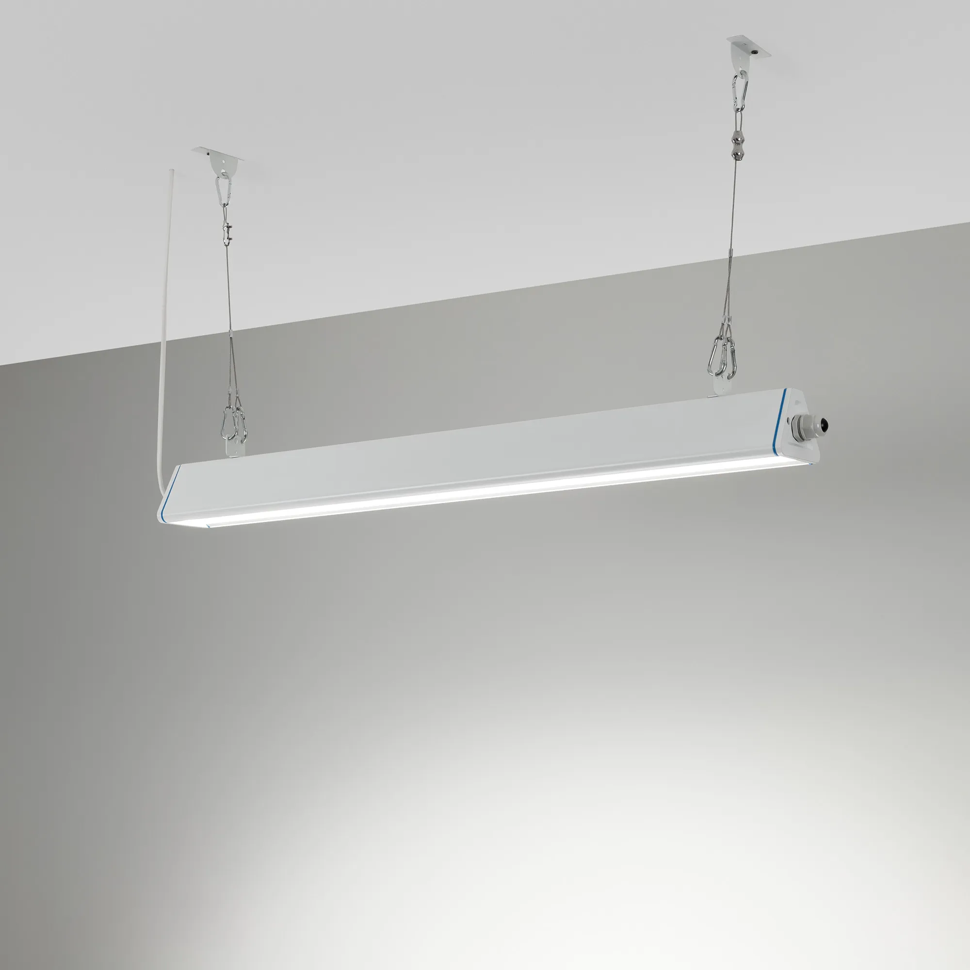 Линейный светильник для освещения складских и промышленных помещений. Мощность 150W, напряжение питания AC 110-277V/50Hz.CRI80. Управление 1-10В. Тип светодиодов SMD2835, с групповой оптической линзой. Цвет свечения ДНЕВНОЙ 5000K, световой поток 22000 Lm, угол рассеивания 50*90°. Цвет корпуса белый, степень пылевлагозащиты IP65. Степень ударопрочности IK08. Габариты 885х105х83 mm. В светильнике присутствует функция защиты от удара молнии. Есть сквозная проводка. Комплект подвеса и крепление для накладного монтажа в КОМПЛЕКТЕ.