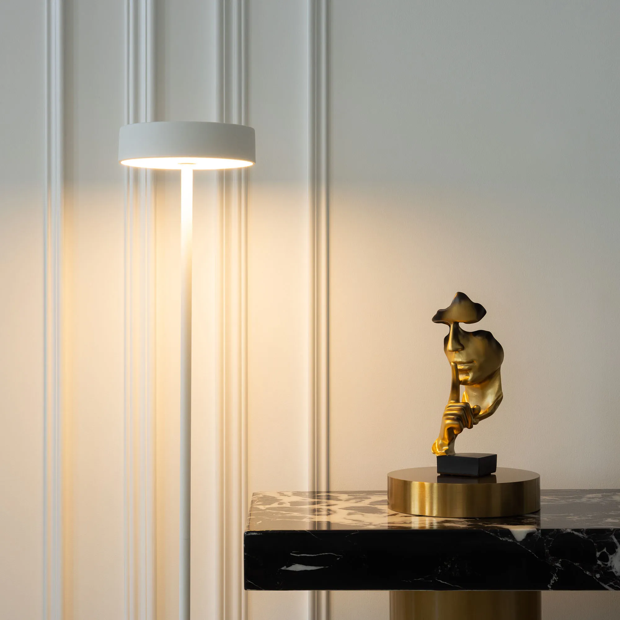 Декоративный напольный светильник. Мощность 16 Вт, св. поток 1230 лм, 76 лм/Вт, теплый 3000 K, CRI>90, угол 110 °. Фигурный корпус из стали белого цвета, матовый экран PMMA, степень защиты IP20. Размер светоизлучателя: Ø200х54 мм; размер основания: Ø120 x 200 мм; размер ножки: Ø16,4 x 1100 мм; общая высота: 1354 мм. Пульсация < 2%. Длина провода 2400 мм, питание от сети AC 220-240V.