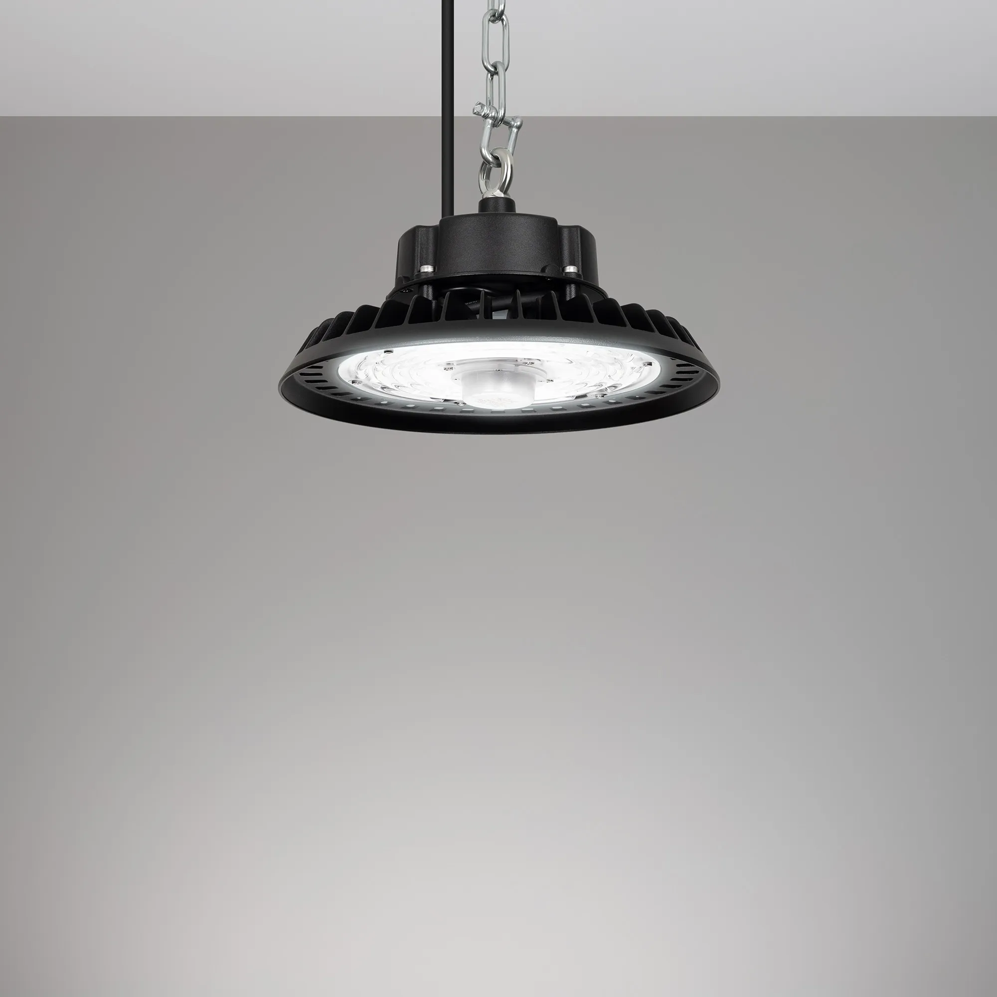 Светильник для освещения складских и промышленных помещений. Мощность 100W, напряжение питания AC 120-270V/50Hz. CRI 80. Тип светодиодов SMD2835, с групповой оптической линзой. Цвет свечения ДНЕВНОЙ 5000K, световой поток 15000 Lm, угол рассеивания 90°. Доступно управление по протоколу 0-10В. Цвет корпуса черный, линза из поликарбоната, степень влагозащиты IP65. Габариты Ф260xH140мм. Рым-болт в комплекте. Датчик настраивается с помощью пульта 052018 (один на все датчики). Длина кабеля питания 900 мм.