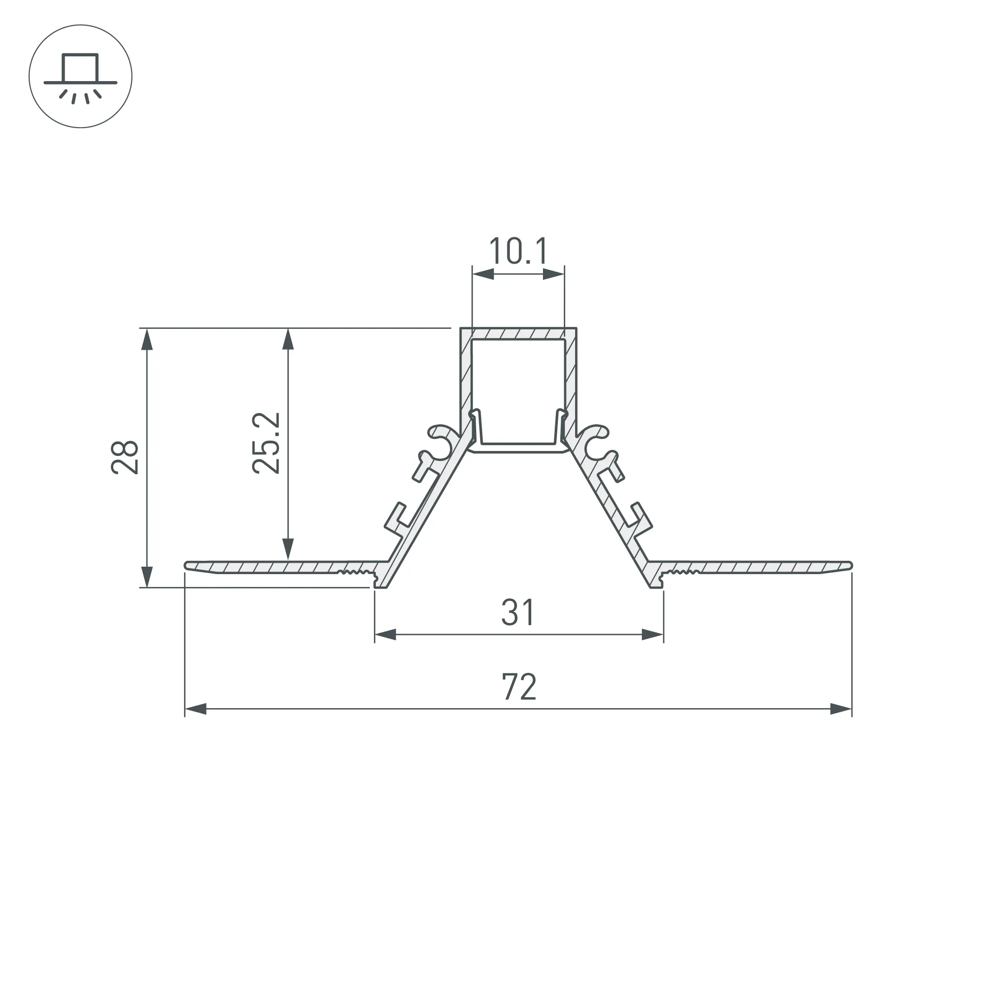 Алюминиевый анодированный профиль для светодиодных лент и линеек. Скрытая установка (под строительную отделку). Экран утоплен в плоскости профиля, что позволяет скрыть источник света от прямого контакта с глазами. Габаритные размеры (L×W×H): 2000x72x28 мм. Ширина площадки для ленты 10,1 мм. Экраны, заглушки и другие аксессуары приобретаются отдельно. Цена за 1 метр.