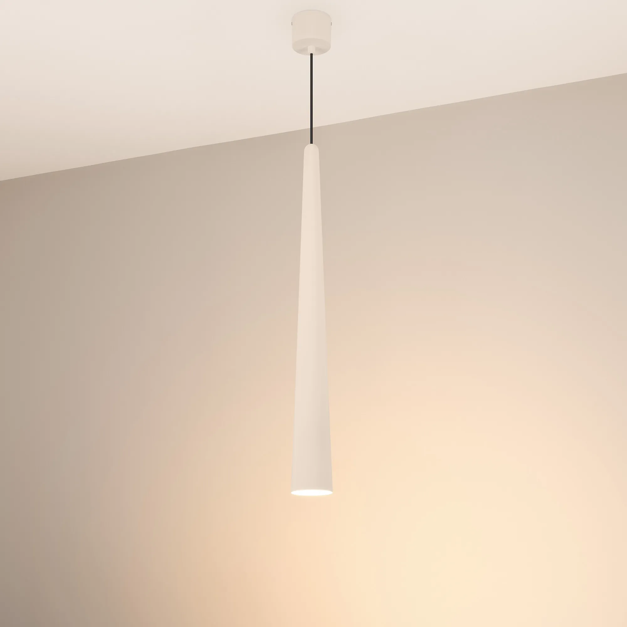 Подвесной светильник. Мощность 5 Вт, св. поток 400 лм, 70 лм/Вт, теплый 2700 K, CRI>92, угол 36°, напряжение питания 230 В. Кремовый конусообразный вытянутый корпус из алюминия, линза из PMMA, степень защиты IP20. Размер: диаметр 76 мм, высота 670 мм. Монтаж подвесной, длина подвеса 1330 мм, регулируемая. В комплекте 2 вида чаш. Габариты встраиваемой чаши: Ø 80x41 мм. Габариты накладной чаши Ø80x60 мм. Драйвер 2,8-12В, 500 мА, пульсация <1%.
