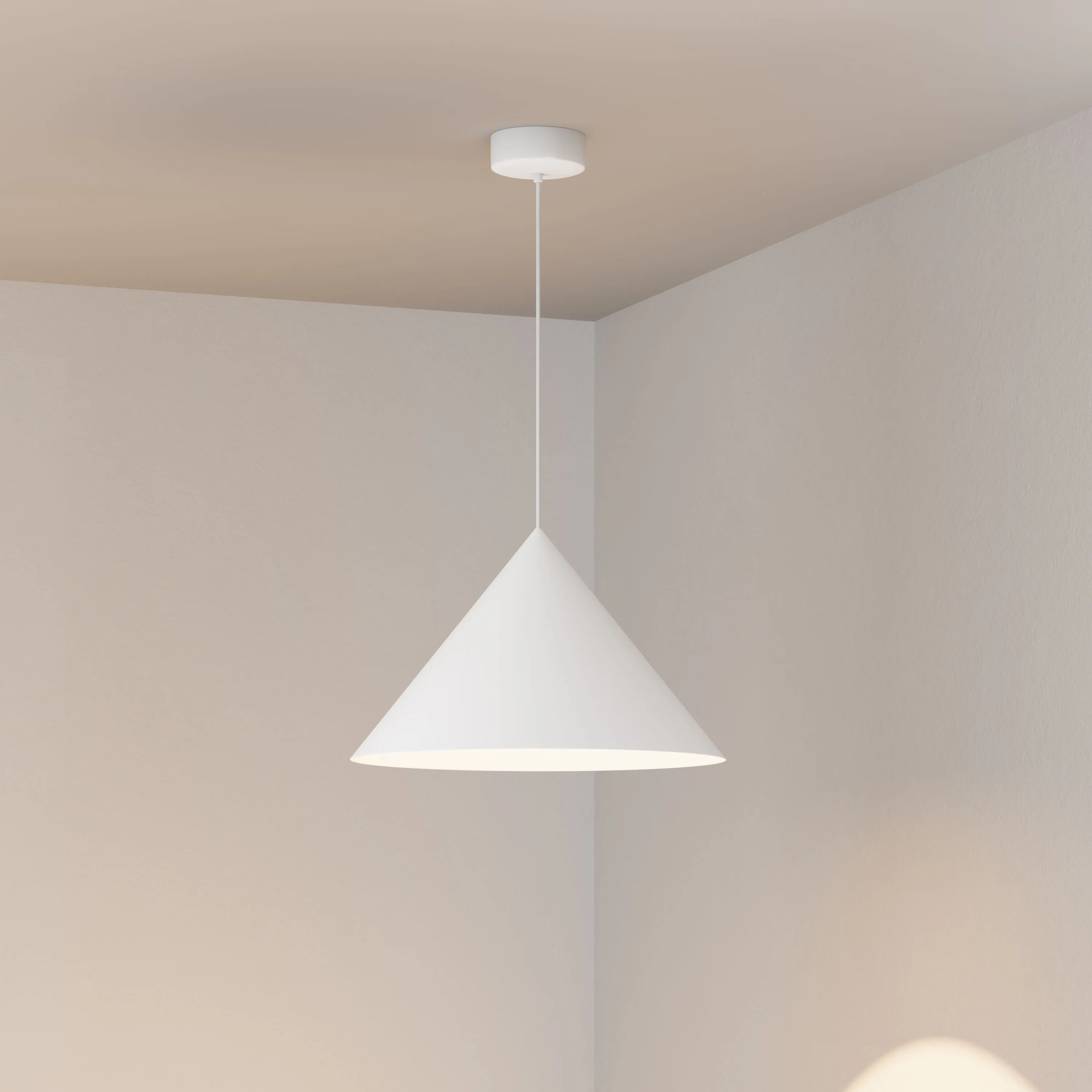 Подвесной светильник. Мощность 14 Вт, св. поток 1200 лм, 74 лм/Вт, тёплый 3000 K, CRI>92, угол 36°, напряжение питания 230 В. Белый корпус из алюминия в форме конуса с белой внутренней поверхностью, линза-рассеиватель из PMMA, степень защиты IP20. Размер: диаметр 550 мм, высота 340 мм. Монтаж подвесной, длина подвеса 2000 мм, регулируемая. В комплекте 2 вида чаш. Габариты встраиваемой чаши: Ø 80x23 мм. Габариты накладной чаши Ø140x55 мм. Драйвер 27-42 В, 350 мА, пульсация <1%. Управление по TRIAC.
