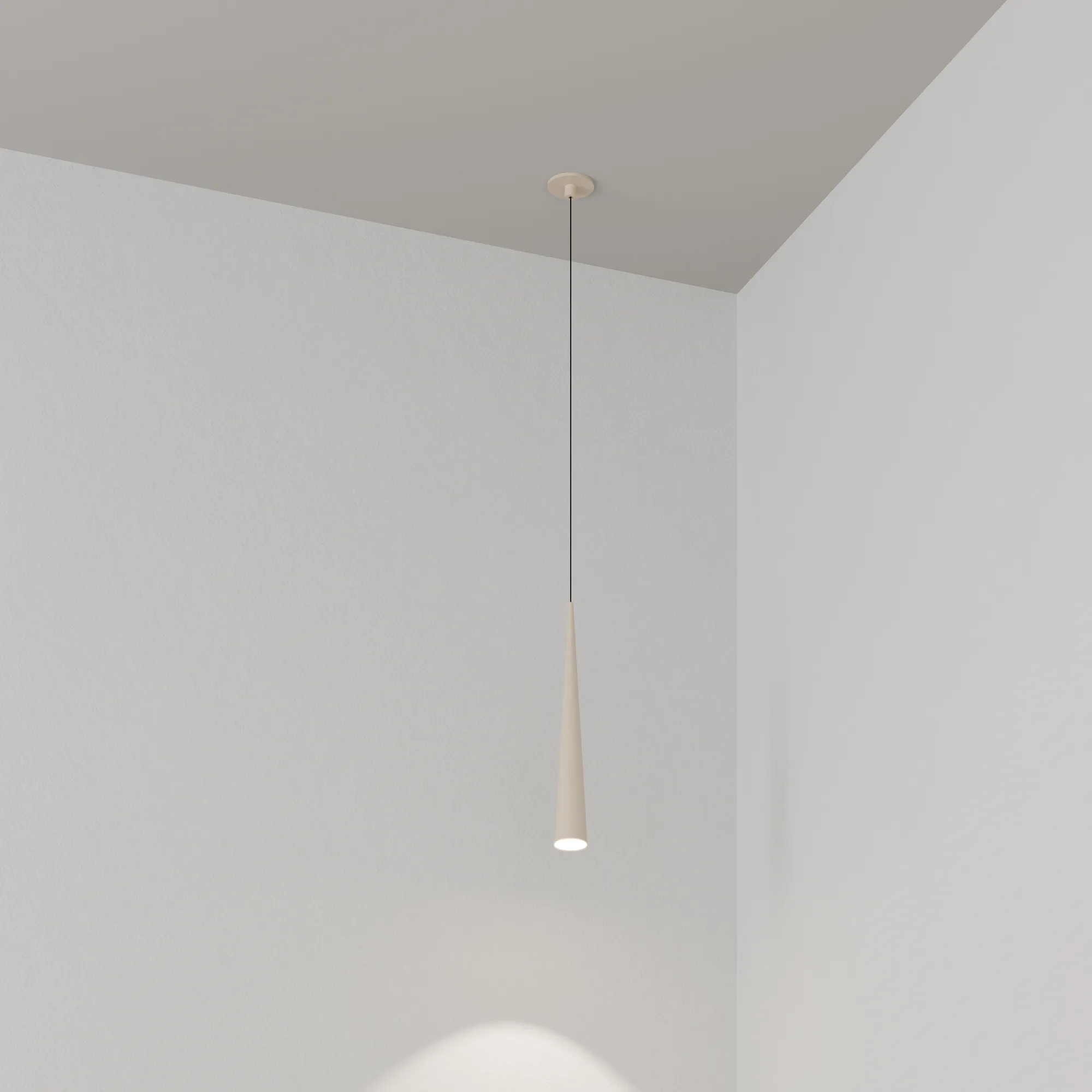 Подвесной светильник. Мощность 5 Вт, св. поток 400 лм, световая эффективность 70 лм/Вт, теплый 3000K, CRI>92, угол 36°, напряжение питания 230 В. Кремовый конусообразный вытянутый корпус из алюминия, линза из PMMA, степень защиты IP20. Размер: диаметр 57 мм, высота 400 мм. Монтаж подвесной, длина подвеса 2000 мм, регулируемая. В комплекте 2 вида чаш. Габариты встраиваемой чаши: Ø 80x41 мм. Габариты накладной чаши Ø80x60 мм. Драйвер 2,8-12В, 500 мА, пульсация <1%.