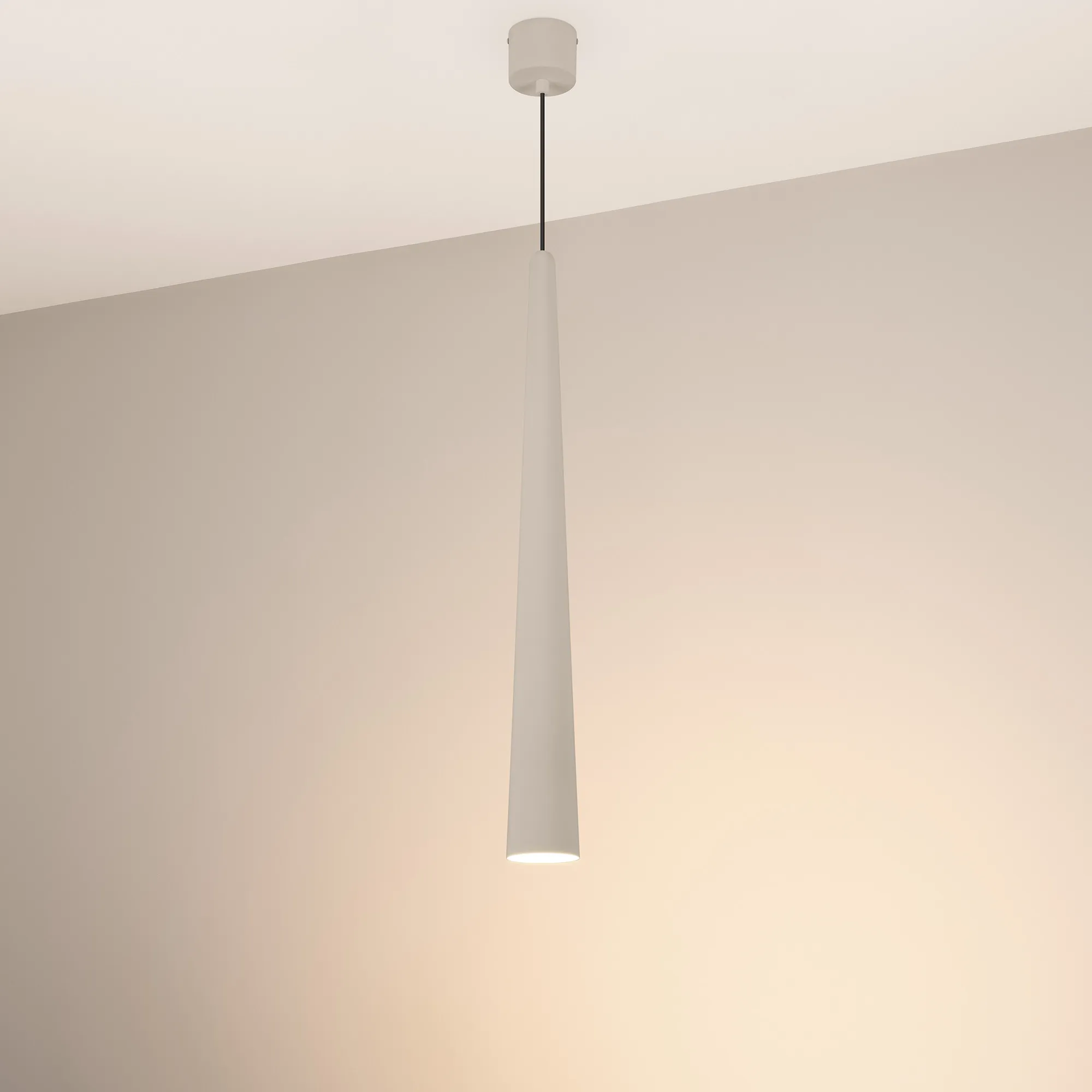 Подвесной светильник. Мощность 5 Вт, св. поток 400 лм, 70 лм/Вт, теплый 3000K, CRI>92, угол 36°, напряжение питания 230 В. Светло - серый конусообразный вытянутый корпус из алюминия, линза из PMMA, степень защиты IP20. Размер: диаметр 76 мм, высота 670мм. Монтаж подвесной, длина подвеса 2000 мм, регулируемая. В комплекте 2 вида чаш. Габариты встраиваемой чаши: Ø 80x41 мм. Габариты накладной чаши Ø80x60 мм. Драйвер 2,8-12В, 500 мА, пульсация <1%.