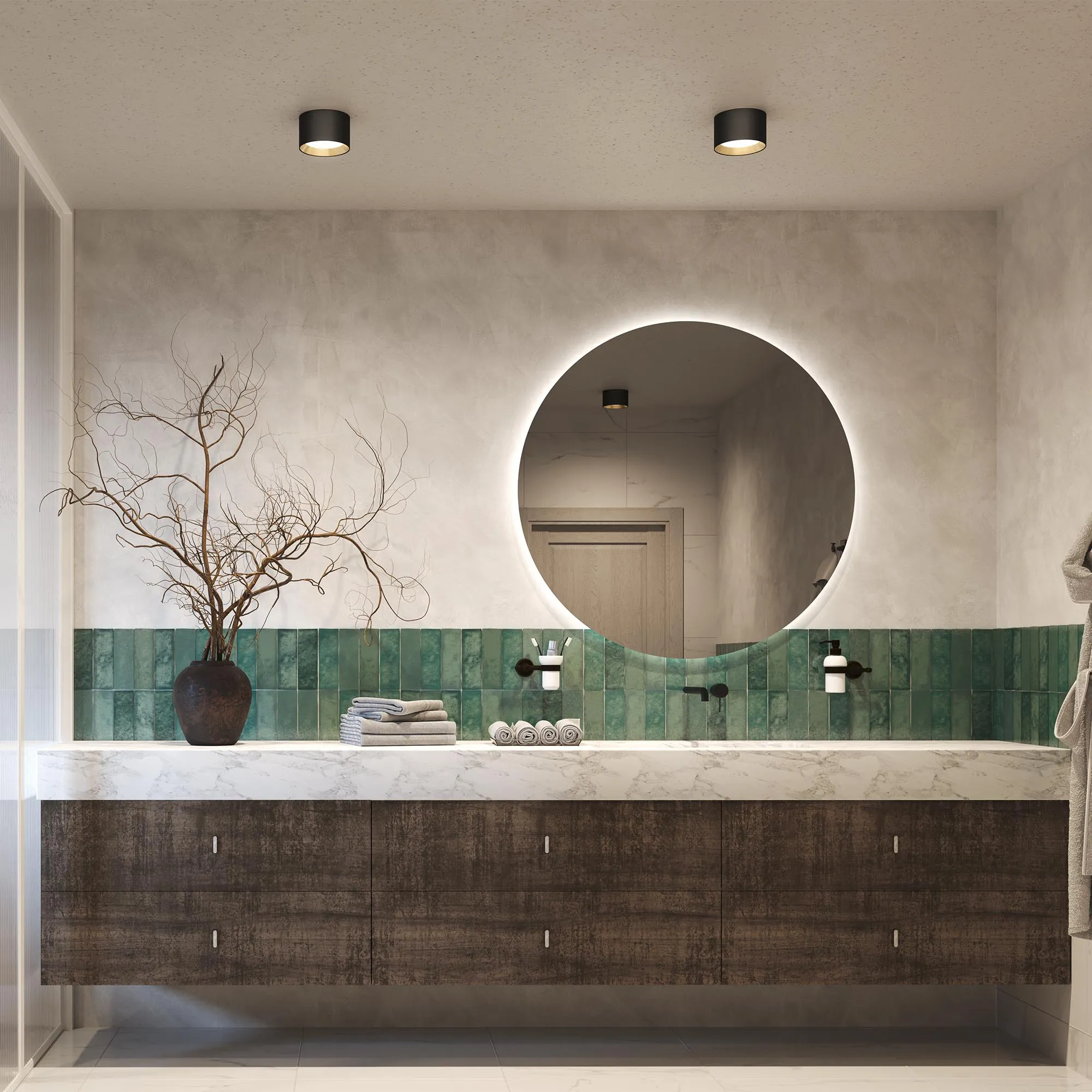 Накладной светильник. Мощность 8 Вт, св. поток 620-640 лм, 80-85 лм/Вт, теплый 2700 K, теплый 3300K, дневной 4000K (переключается), CRI>90, угол 80°, напряжение питания 230 В. Черный круглый корпус из алюминия, экран PC, степень защиты IP54. Размер: диаметр 90 мм, высота 75 мм. Монтаж накладной. Драйвер 27-43 В, 200 мА, пульсация < 2 %.