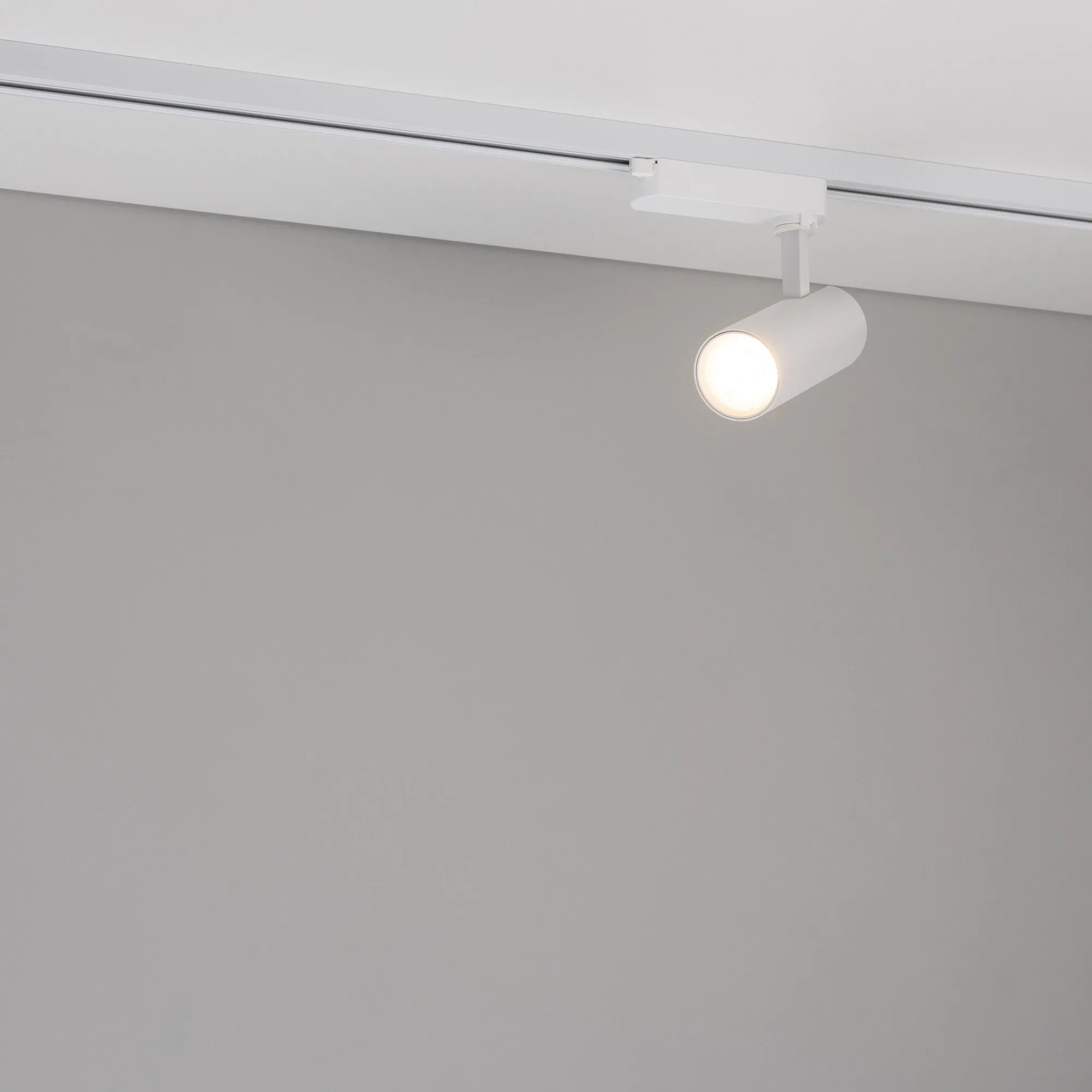 Светильник для треков/шин 2 провода. Мощность 15 Вт, св. поток без решетки honeycomb 1500 лм, 100 лм/Вт, с решеткой honeycomb 990 лм, 66 лм/Вт, тёплый 3000 K, CRI>90, угол 24°, напряжение питания 230 В. Белый круглый корпус из алюминия, материал линзы PMMA, степень защиты IP20. Размер: диаметр 60 мм, длина световой части 141 мм. Монтаж на трек 1-фазный. Драйвер встроенный 350 мА 25-40 В, пульсация <5%.