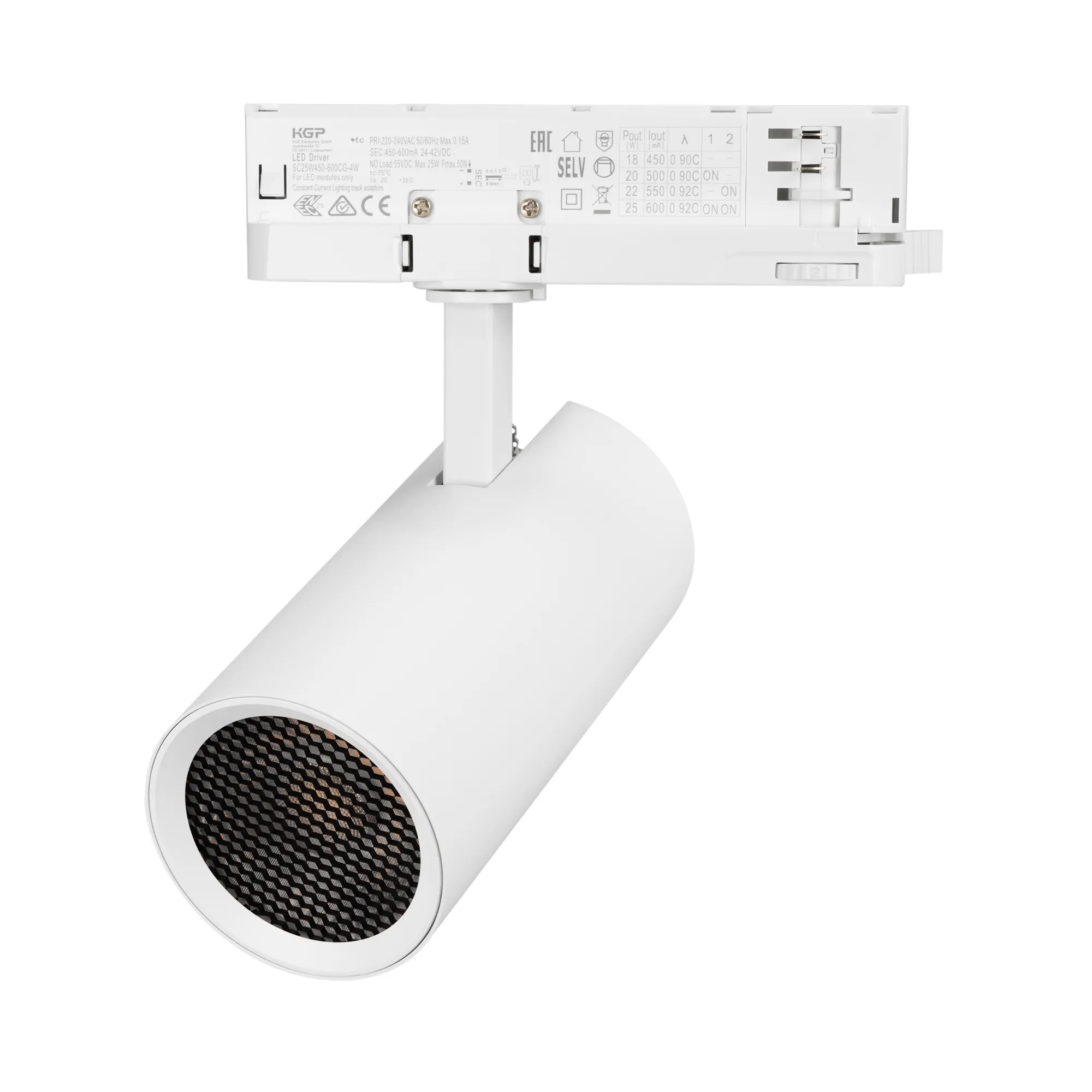 Светильник для треков/шин 4 провода. Мощность 20 Вт, св. поток без решетки honeycomb 2000 лм, 100 лм/Вт, с решеткой honeycomb 1320 лм, 66 лм/Вт, теплый 3000 K, CRI>90, угол 24°, напряжение питания 230 В. Белый круглый корпус из алюминия, материал линзы PMMA, степень защиты IP20. Размер: диаметр 74 мм, длина световой части 154 мм. Монтаж на трек 3-фазный. Драйвер встроенный 24-42 В, 500мА., пульсация <5%