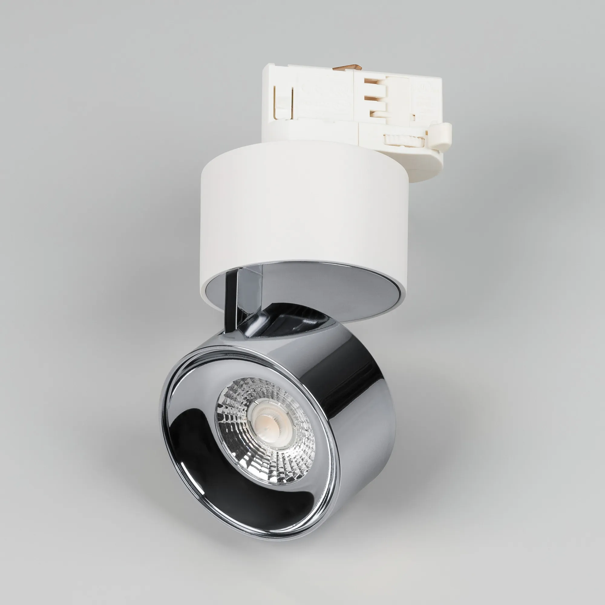 Светильник для треков/шин 4 провода. Мощность 9 Вт, св. поток 580 лм, 64 лм/Вт, дневной 4000 K, CRI>90, угол 36°, напряжение питания 230 В. Модуль цвет хром, белый круглый корпус из алюминия, степень защиты IP20. Размеры корпуса: длина адаптера 86 мм, ширина 32 мм, высота 38,2 мм., высота основания 46 мм. Размер светодиодного модуля: диаметр 77 мм, высота 59 мм. Монтаж на трек 3-фазный. Драйвер 38 В, 200 мА, пульсация <1%.