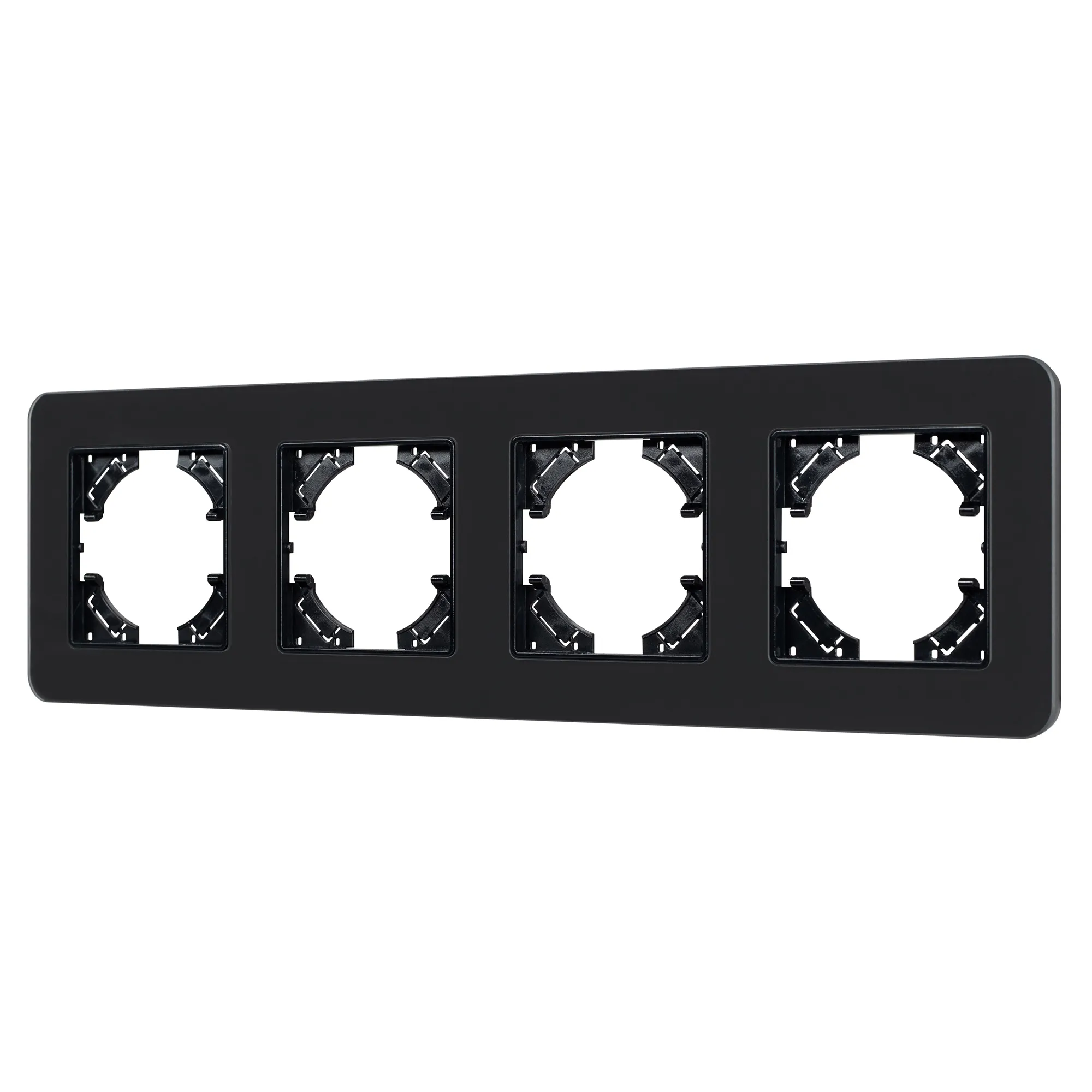 Рамка стеклянная на 4 поста, под встраиваемый механизм. Цвет - черный с Soft-Touch покрытием. Уровень герметичности IP20. Ориентация монтажа - горизонтальная (основным ориентиром служат посадочные выступы для накладки механизма).