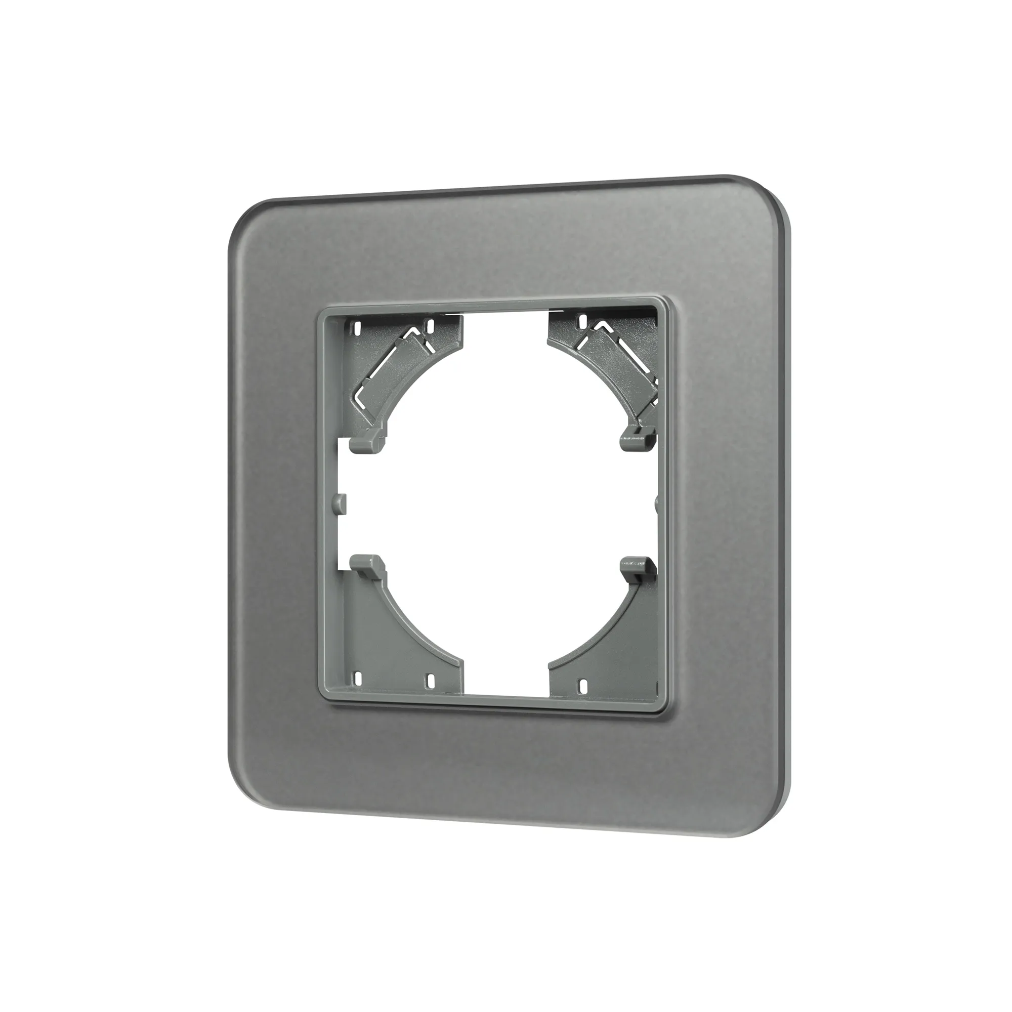 Рамка стеклянная на 1 пост, под встраиваемый механизм. Цвет - серый с Soft-Touch покрытием. Уровень герметичности IP20. Ориентация монтажа - горизонтальная (основным ориентиром служат посадочные выступы для накладки механизма).