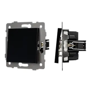 Механизм выключателя света клавишный на 1 пост 1 возвратная клавиша. Цвет - черный. Без фронтальной рамки. Уровень пылевлагозащиты IP20. Выключатель устанавливается в стандартный круглый подрозетник.
