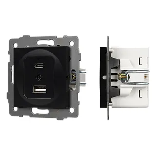 Механизм розетки с заземлением на 2 USB type A+C порта. Цвет - черный. Без фронтальной рамки. Уровень пылевлагозащиты IP20. Устанавливается в стандартный подрозетник.