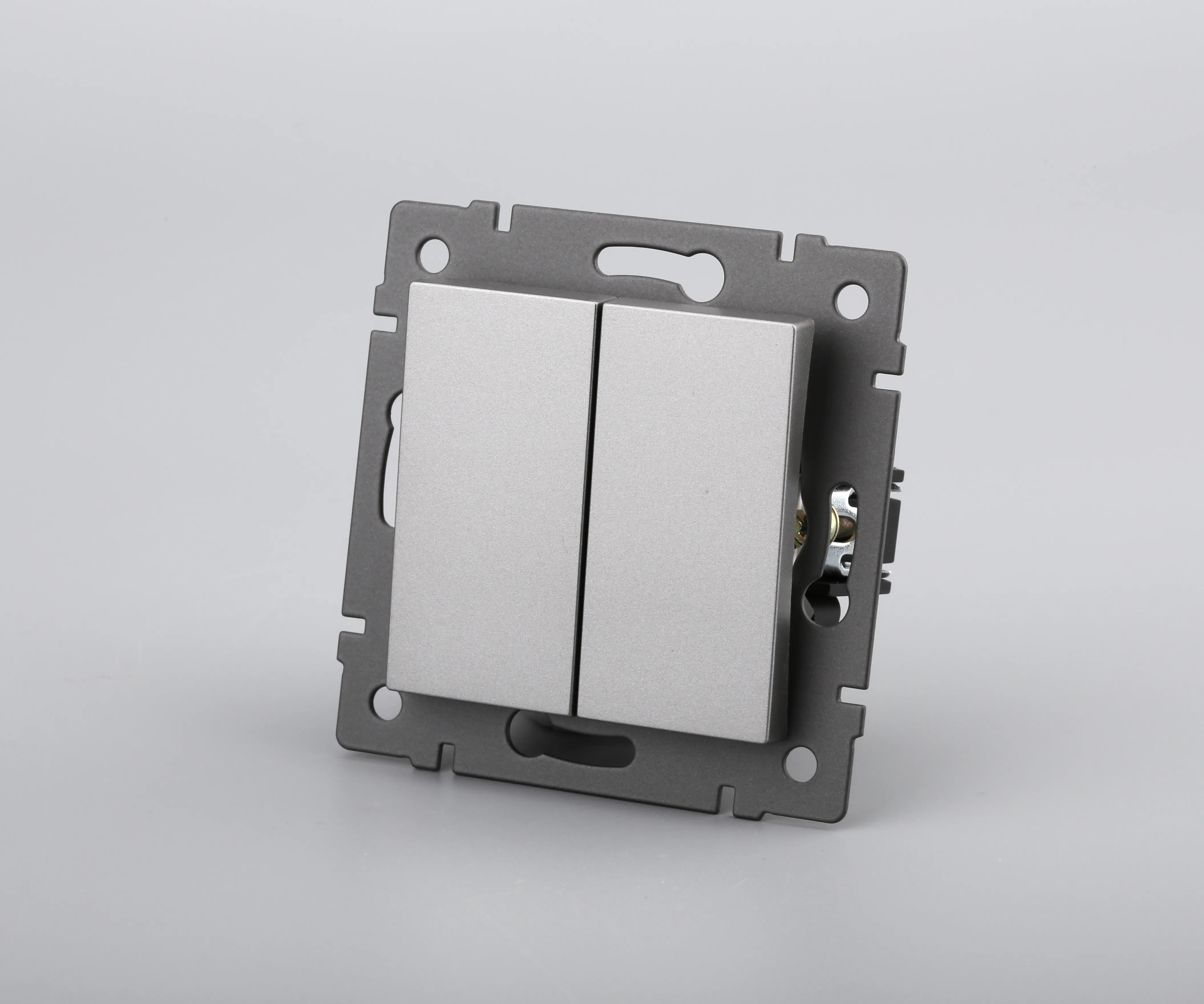 Механизм выключателя света клавишный на 1 пост 2 клавиши (проходной). Цвет - серый. Без фронтальной рамки. Уровень пылевлагозащиты IP20. Выключатель устанавливается в стандартный круглый подрозетник.