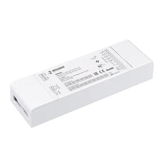 5-канальный диммер тока для DIM/MIX/RGB/RGBW/RGB-MIX источников света. Управление 2.4G+WiFi, интерфейс TUYA (через Tuya ZigBee шлюз), Push-Dim, совместим с приложением INTELLIGENT ARLIGHT. Питание 12-48VDC, выходное 3-45 VDC напряжение ,ток 150-500mA на канал, 5 каналов, максимальная мощность 2.25W-112.5W. Ток и тип источника света устанавливаются dip-переключателями. Габариты 179х56х30 мм. Управляется пультами и панелями серии SMART (поставляются отдельно).