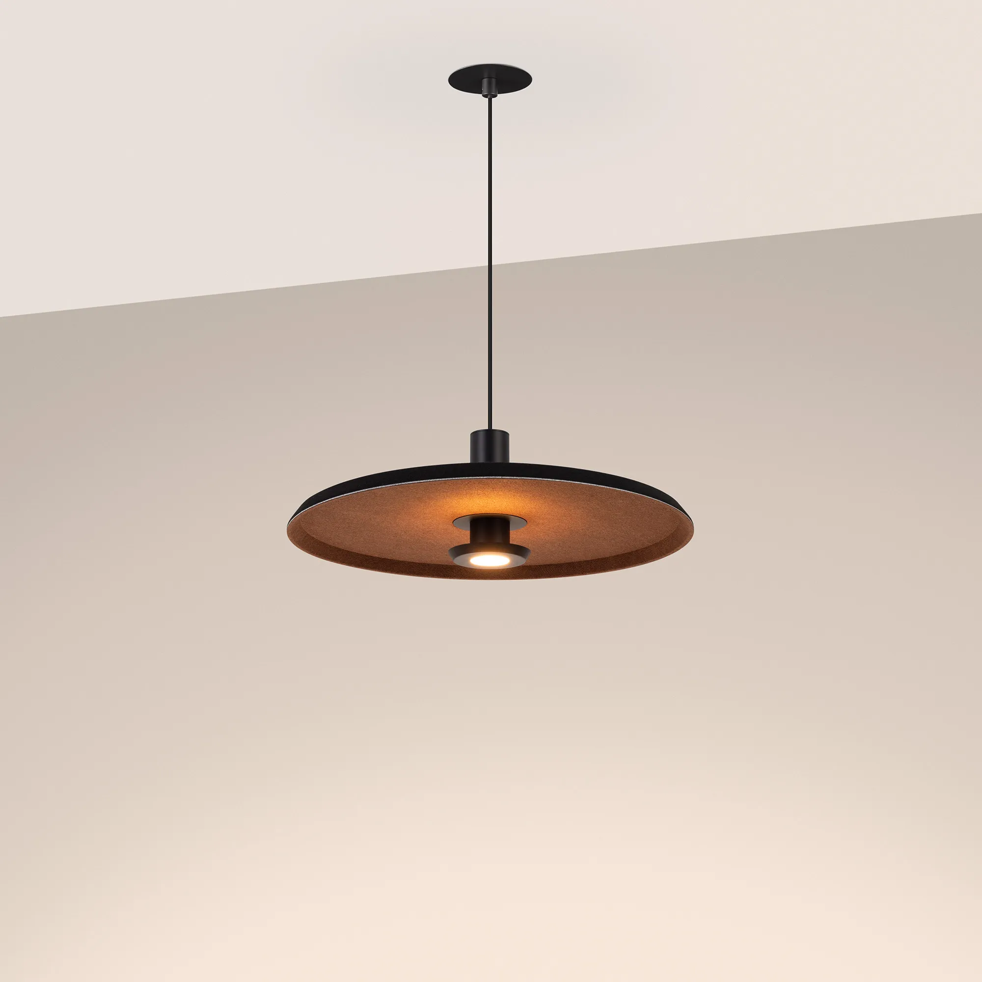 Подвесной светильник. Мощность 12 Вт, св. поток 768 лм, 64 лм/Вт, теплый 3000 K, CRI>94, угол 36°, напряжение питания 230 В.Черный фигурный плафон из переработанного фетра с кофейной внутренней поверхностью, линза-рассеиватель из PMMA, степень защиты IP20. Размер: диаметр 450 мм, высота 145 мм. Монтаж подвесной, длина подвеса 2000 мм, регулируемая. В комплекте 2 вида чаш. Габариты чаши (встраиваемая) Ø80 х 23 мм, врезное отверстие Ø60 мм. Габариты чаши (накладная) Ø120 x 35 мм. Драйвер 59В, 300 мА, пульсация <1%. Управление по TRIAC.
