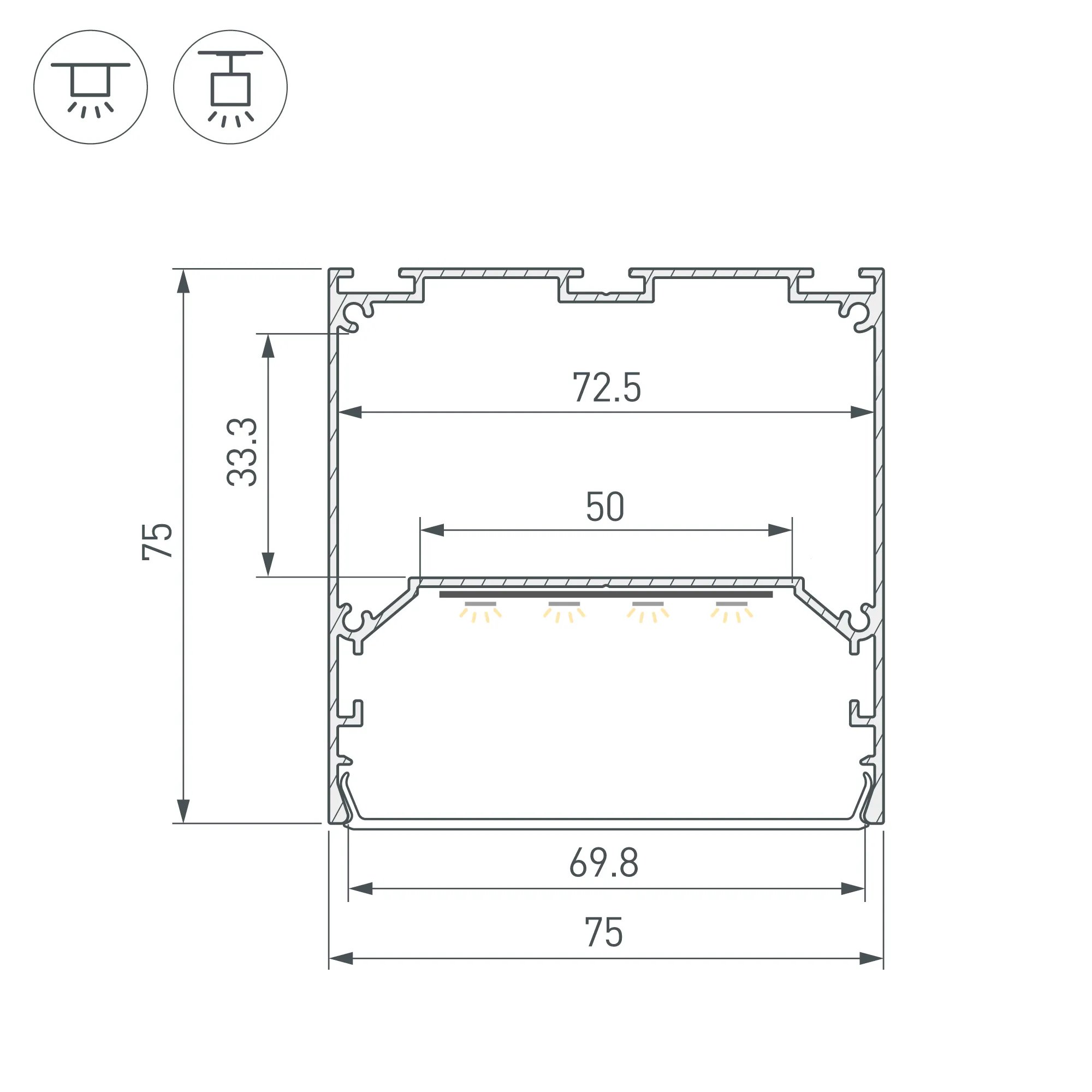 Алюминиевый анодированный профиль для светодиодных лент и линеек. Габаритные размеры (L×W×H): 2500x75x75 мм. Ширина площадки для ленты 50 мм. Отсек для БП 72,5х33,3 мм. Экраны, заглушки и другие аксессуары приобретаются отдельно. Цена за 1 метр.