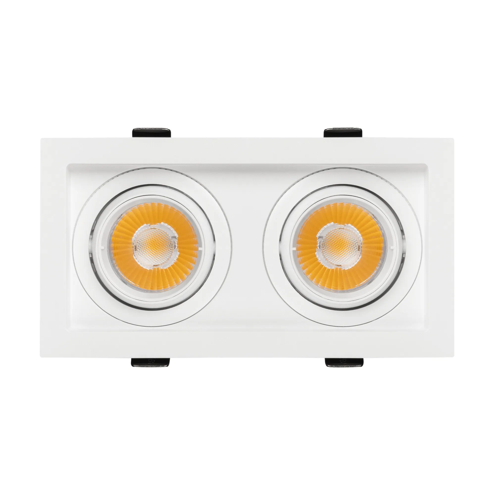 Встраиваемый карданный светильник. Мощность 2х12 Вт, св. поток 2636 лм, 109 лм/Вт, дневной 4000 K, CRI>92, угол 20°, напряжение питания 230 В. Белый корпус из алюминия, белая вставка, степень защиты IP20. Размер: длина 170 мм, ширина 90 мм, высота 80 мм. Монтаж встраиваемый, установочное отверстие: длина 155 мм, ширина 75 мм. Драйвер 27-40 В, 300 мА, пульсация <2%.