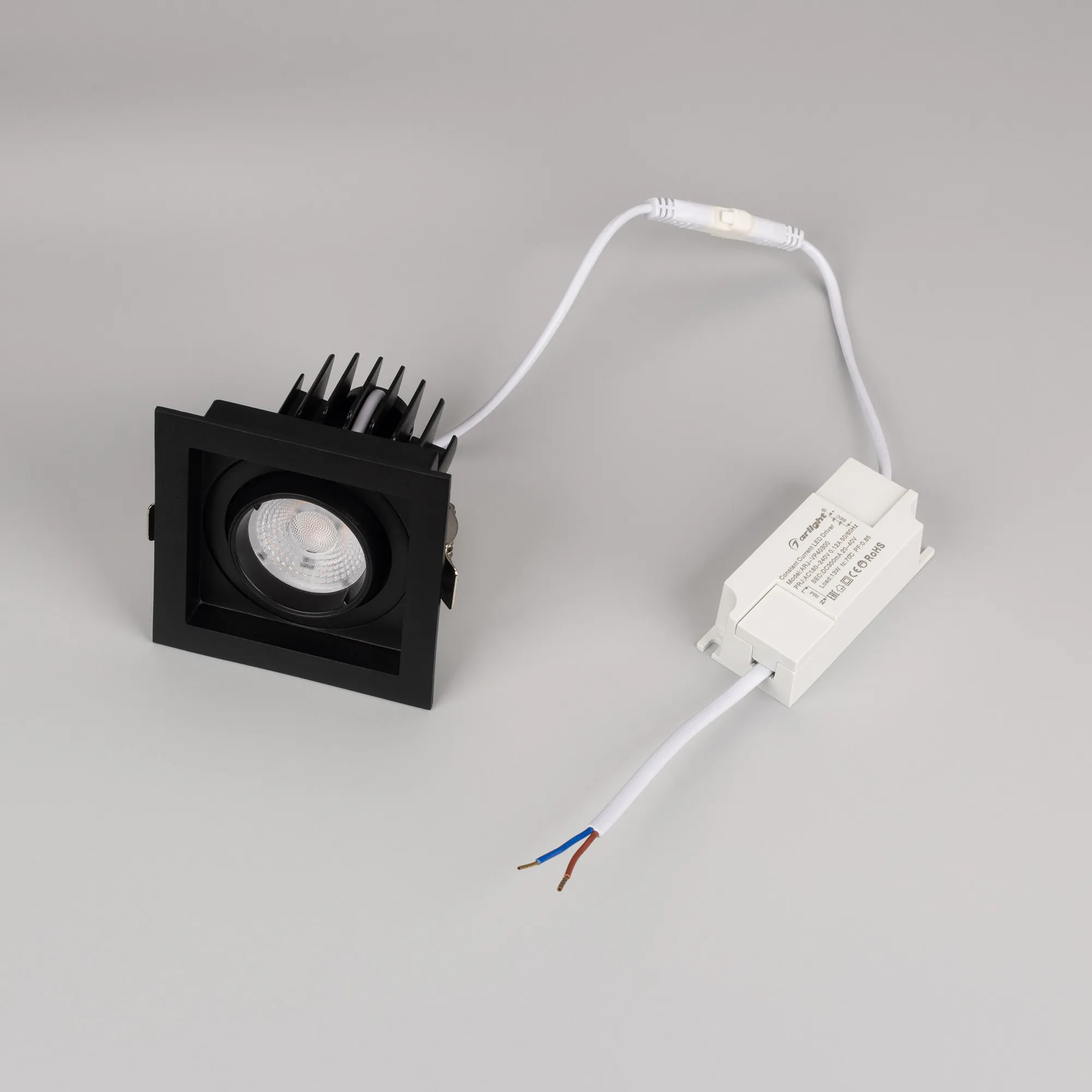 Встраиваемый карданный светильник. Мощность 12 Вт, св. поток 1394 лм, 116 лм/Вт, тёплый 3000 K, CRI>92, угол 40°, напряжение питания 230 В. Чёрный корпус из алюминия, чёрная вставка, степень защиты IP20. Размер: длина 90 мм, ширина 90 мм, высота 80 мм. Монтаж встраиваемый, установочное отверстие: длина 75 мм, ширина 75 мм. Драйвер 27-40 В, 300 мА, пульсация <2%.