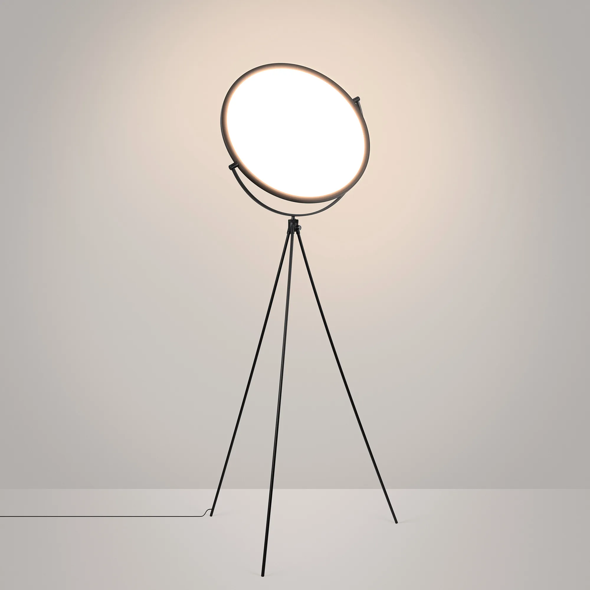 Декоративный напольный светильник с функцией Dim-to-Warm. Мощность 35 Вт, Dim-to-warm 1800K-3000K, CRI>90, угол 120 °, напряжение питания 230 В. Корпус из алюминия черного цвета, экран из PMMA, степень защиты IP20. Размер: диаметр диска 660 мм, диаметр излучающего модуля 595мм, высота с ножкой 1890 м. Угол поворота диска 355°. Длина провода 1300 мм, питание от сети 220-240V. Адаптер в комплекте.
