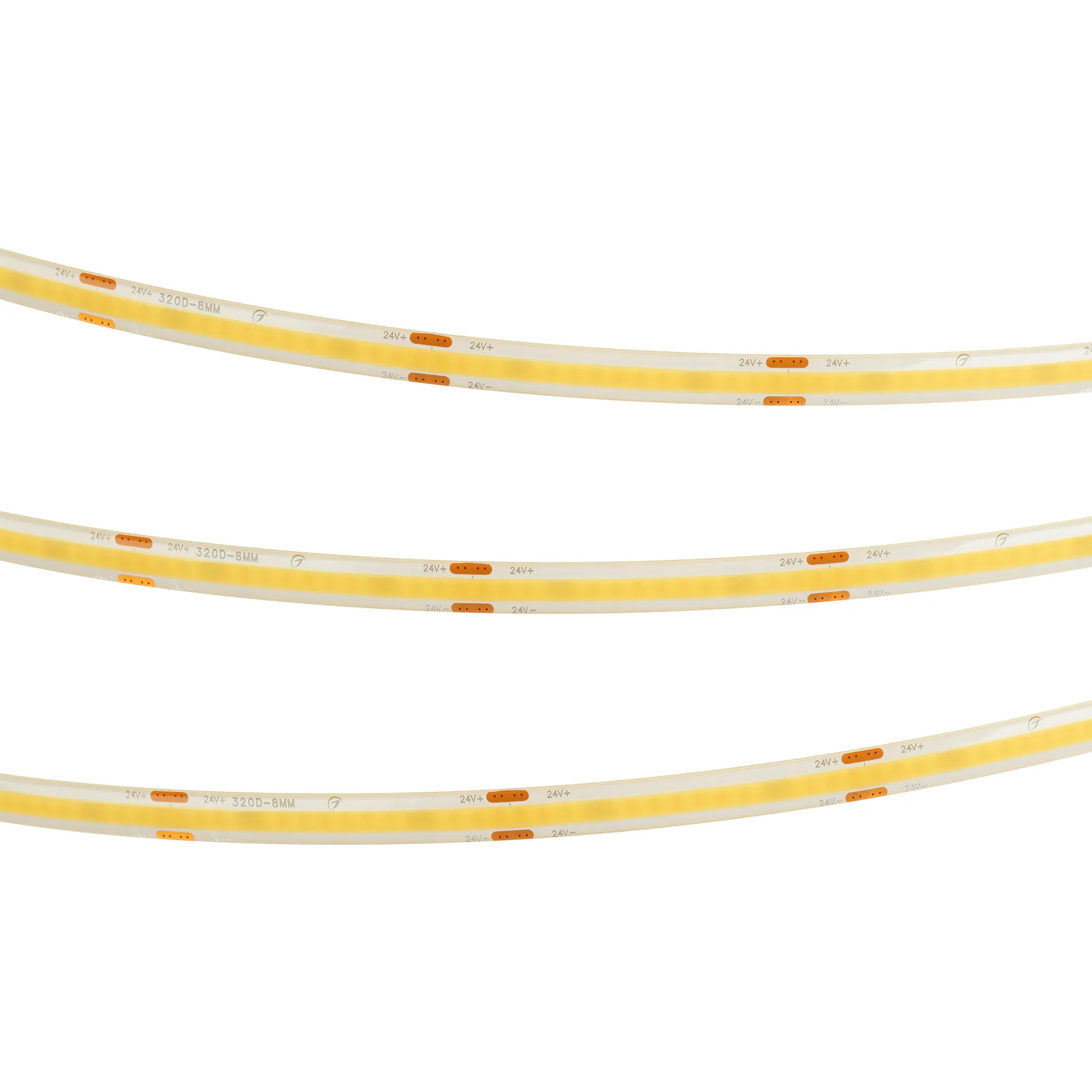 Светодиодная герметичная лента сплошного свечения COB серии X320, IP65 (SE - силиконовый верхний слой). Светодиоды CSP, 320 шт/м, белая плата шириной 8 мм, скотч 3M. Цвет свечения ТЕПЛЫЙ 3000K, индекс цветопередачи CRI>90, угол 150°. Мощность 8 Вт/м (45 Вт на 5м), питание 24 В. Размеры 5000х8х2.6 мм. Мин. отрезок 50 мм. Цена за 1 м. Рекомендуется установка на профиль.