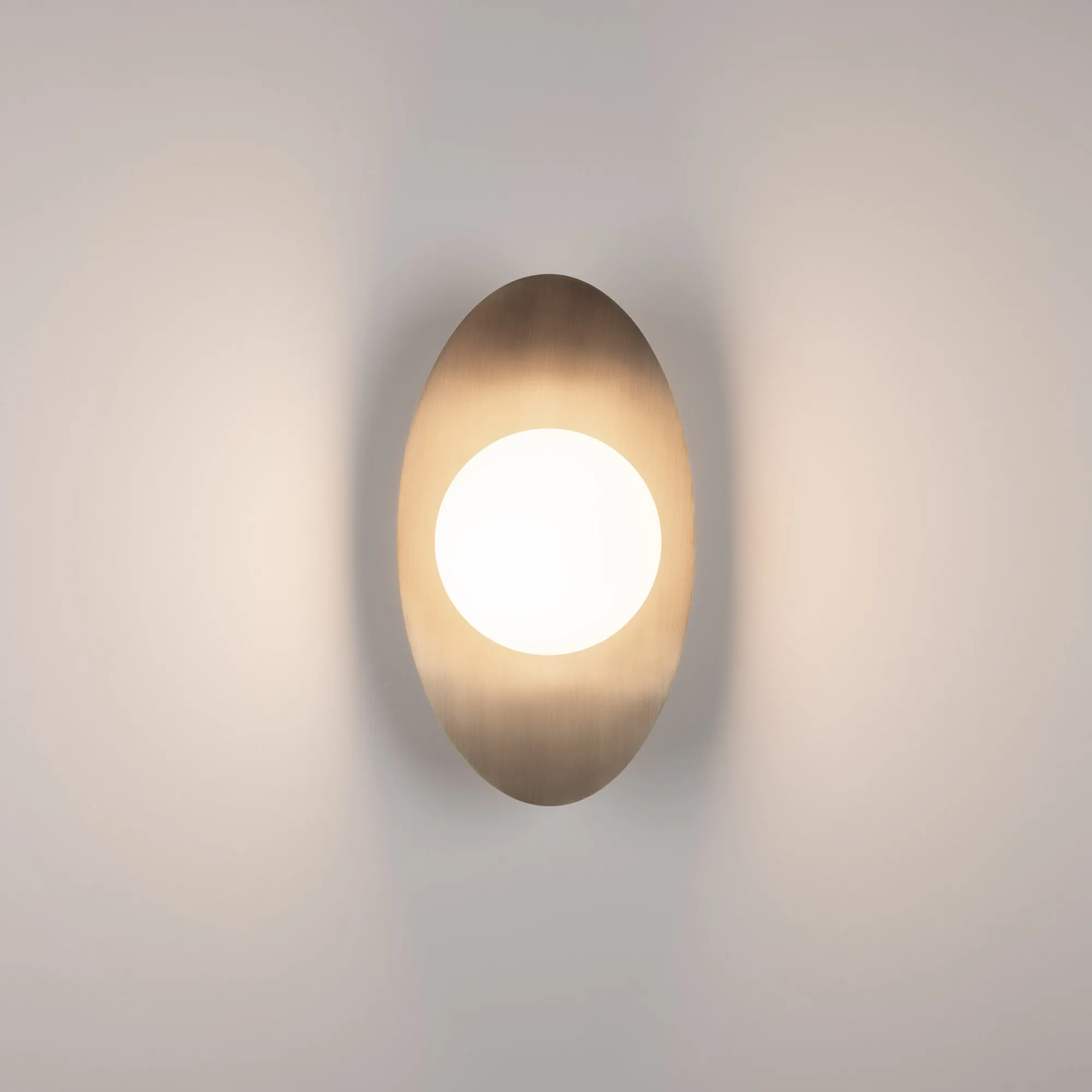 Декоративный настенный светильник. Мощность 6 Вт, св. поток 325-340 лм, 50-52 лм/Вт, теплый 2700 K,теплый 3200К, дневной 4000 K (переключаются), CRI>92, угол 150°, напряжение питания 230 В. Фигурный корпус из алюминия, гальванизированного в цвет бронза, экран из матового стекла, степень защиты IP20. Размер: габариты световой части: Ø145x70 мм, габариты чаши: Ø110 x 42 мм. Монтаж накладной. Встроенный блок питания: 12В DC, 0,75А, пульсация <2%. Встроенный диммер TOUCH-DIM.