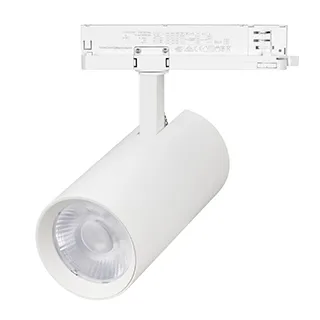 Светильник для треков/шин 4 провода с управлением DALI. Мощность 40Вт, св. поток без решетки honeycomb 4000 лм, 100 лм/Вт, с решеткой honeycomb 2640 лм, 66 лм/Вт, дневной 4000 K, CRI>90, угол 24°. Белый круглый корпус из алюминия, материал линзы PMMA, степень защиты IP20. Размер: диаметр 90 мм, длина световой части 141 мм. Входное напряжение AC220-240V. Драйвер встроенный 10-42В (300-800 мА), 50/60Гц, максимальная мощность 42W. Монтаж на трек 3-фазный.