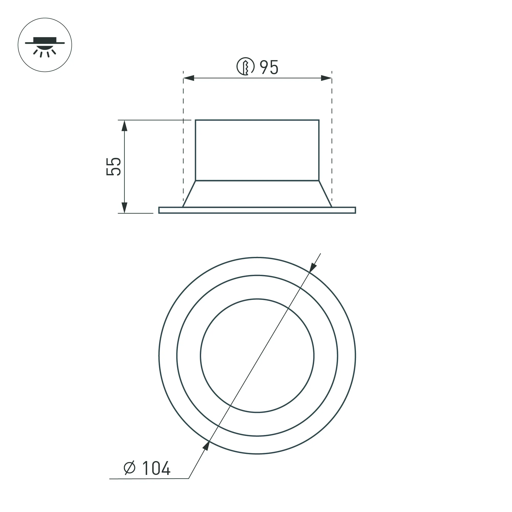 Встраиваемый светильник даунлайт. Мощность 12 Вт, св. поток 670 лм, 56 лм/Вт, тёплый 2700 K, CRI>90, угол 85°, напряжение питания 230 В. Чёрный круглый корпус из алюминия, степень защиты IP20. Размер: диаметр 104 мм, высота 55 мм. Монтаж встраиваемый, установочное отверстие: диаметр 95 мм. Драйвер 27-42 В, 300 мА, пульсация <2%.