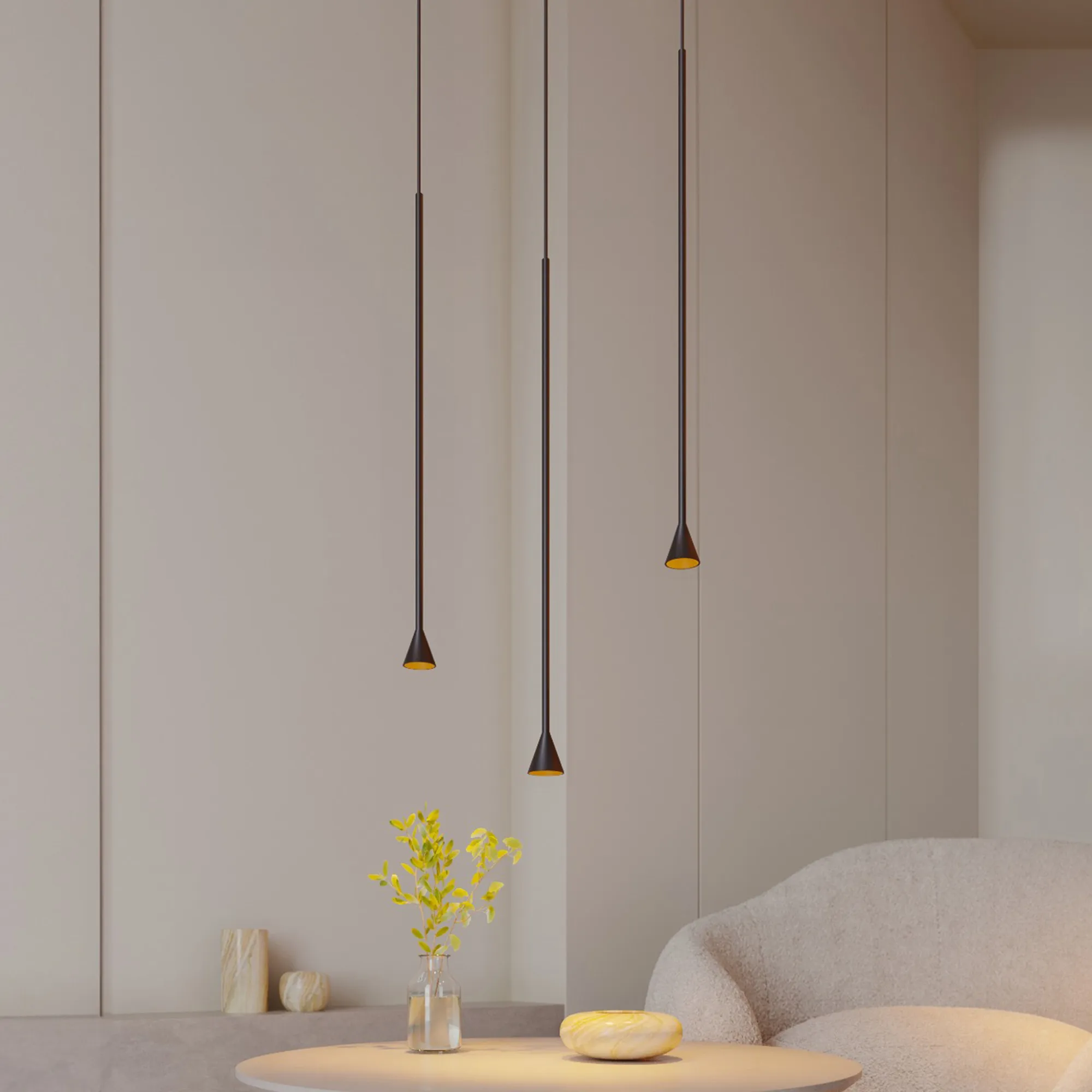 Подвесной светильник. Мощность 5 Вт, св. поток 440лм, 88 лм/Вт, теплый 3000 K, CRI>94, угол 36°, напряжение питания 230 В. Черный корпус из алюминия с конусообразным излучателем, линза-рассеиватель из PMMA, степень защиты IP20. Размер: длина ножки 500 мм, диаметр ножки 10 мм, высота светоизлучателя 63 мм, диаметр светоизлучателя 50 мм. Монтаж подвесной, длина подвеса 1500 мм, регулируемая. В комплекте 2 вида чаш. Габариты чаши (встраиваемая) Ø70 х 35 мм, врезное отверстие Ø60 мм. Габариты чаши (накладная) Ø100 x 40 мм. Драйвер 6-13 В, 500 мА, пульсация <1%.