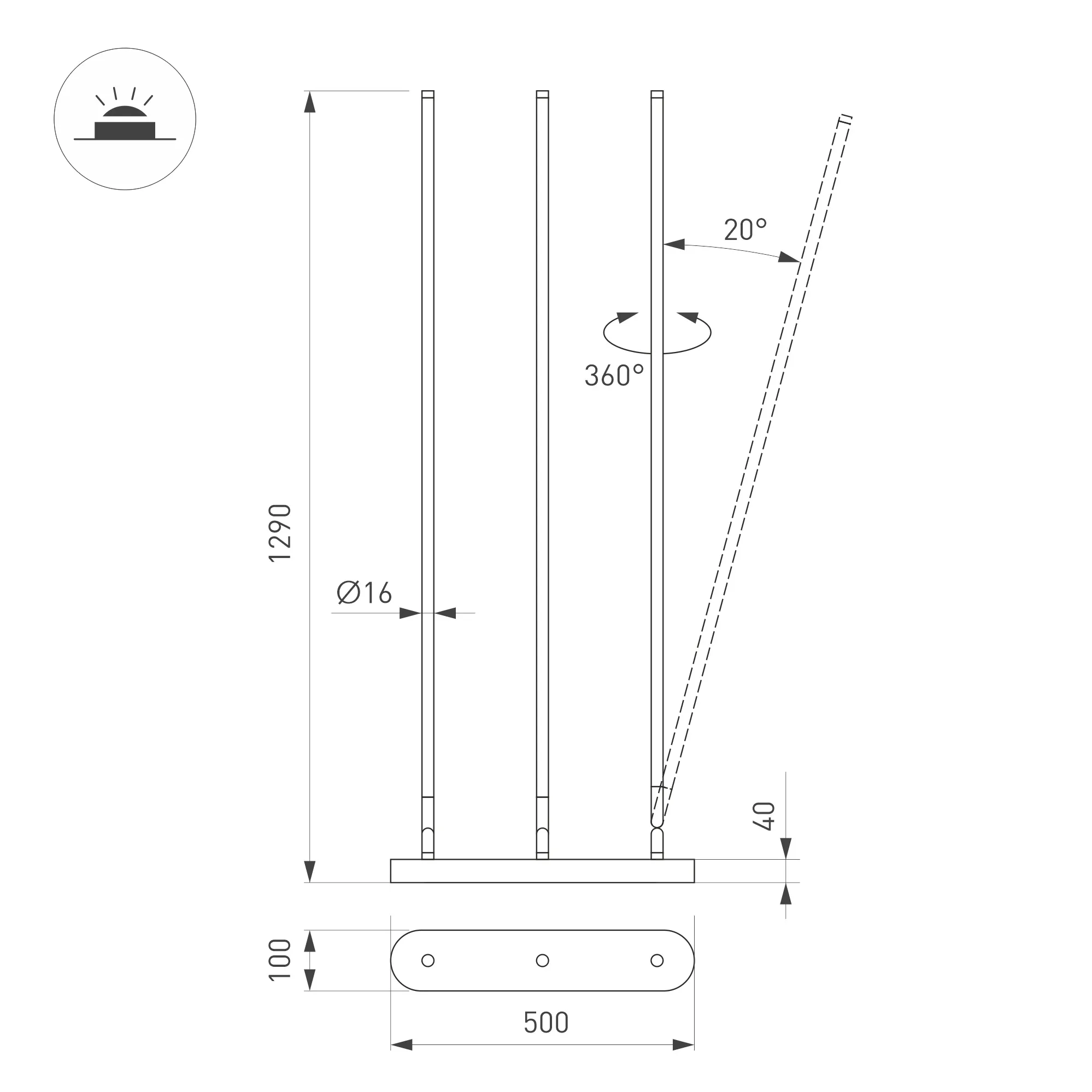 Напольный интерьерный светильник. Мощность 36 Вт, св. поток 1534 лм, 42 лм/Вт, с изменяемой цветовой температурой 2700K/3200K/4000K, CRI>94, угол 120°, напряжение питания 230 В. Черный корпус, степень защиты IP20. Размер: длина 500 мм, ширина 100 мм, высота 1290 мм. Диаметр светового элемента - Ø16 мм. Драйвер встроенный 33-40 В, 900 мА, пульсация <1%.