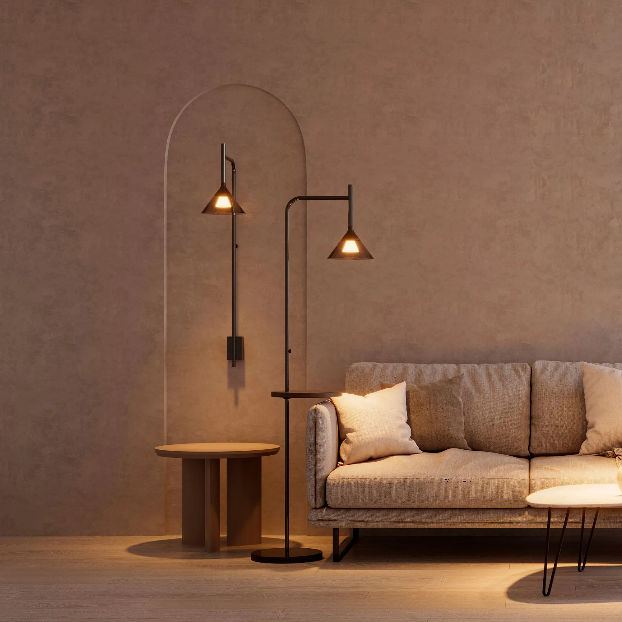 Настенный светильник. Мощность 7 Вт, св. поток 355 лм, 50 лм/Вт, теплый 3000К, CRI>94, угол 30°, напряжение питания 230 В. Черный корпус из алюминия с конусообразным стеклянным плафоном дымчатого цвета, степень защиты IP20. Размеры: диаметр плафона 200 мм, высота плафона 180 мм, высота светильника 1010 мм. Монтаж настенный. Драйвер 12В, 750 мА, пульсация <1%.