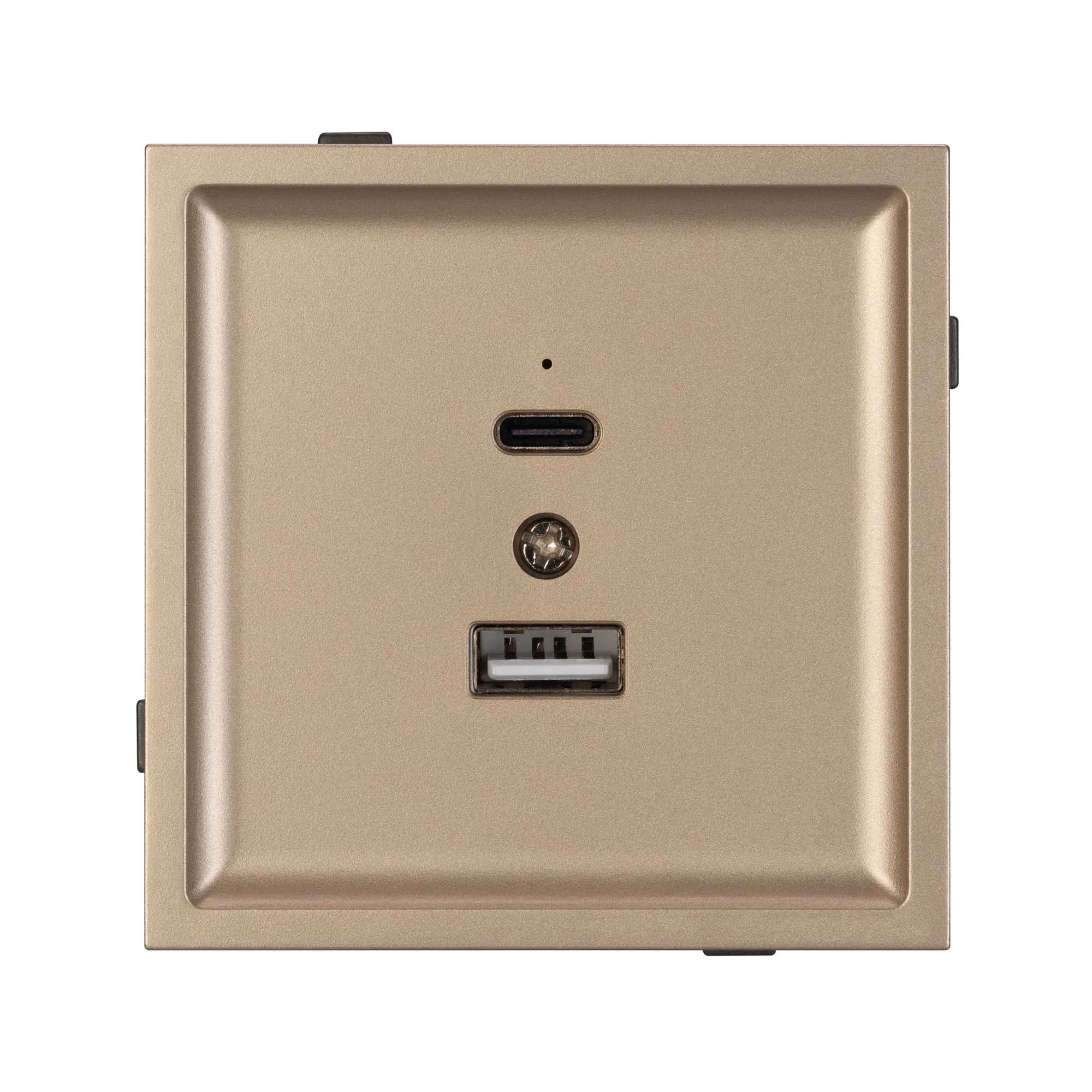 Механизм USB розетки на 2 порта Type A + Type C. Цвет - песочный. Без фронтальной рамки. Выходная мощность для USB Type C порта не превышает 20W. Уровень пылевлагозащиты IP20. Устанавливается в стандартный подрозетник круглого сечения диаметром 60мм.