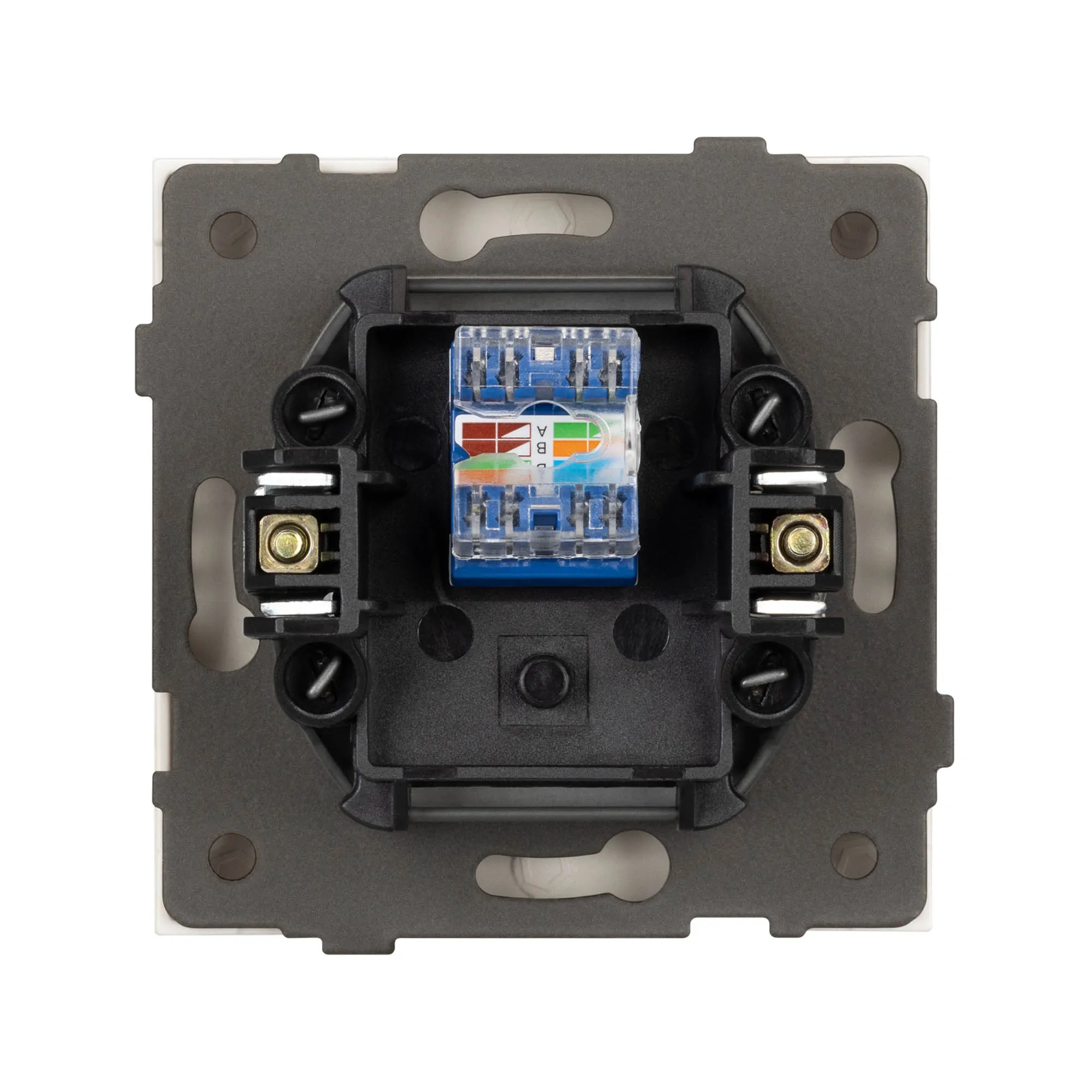 Механизм компьютерной розетки на 1 пост 6-й категории. Цвет - матовый белый, с Soft-Touch покрытием. Без фронтальной рамки. Уровень пылевлагозащиты IP20. Розетка устанавливается в стандартный подрозетник круглого сечения диаметром 60мм.