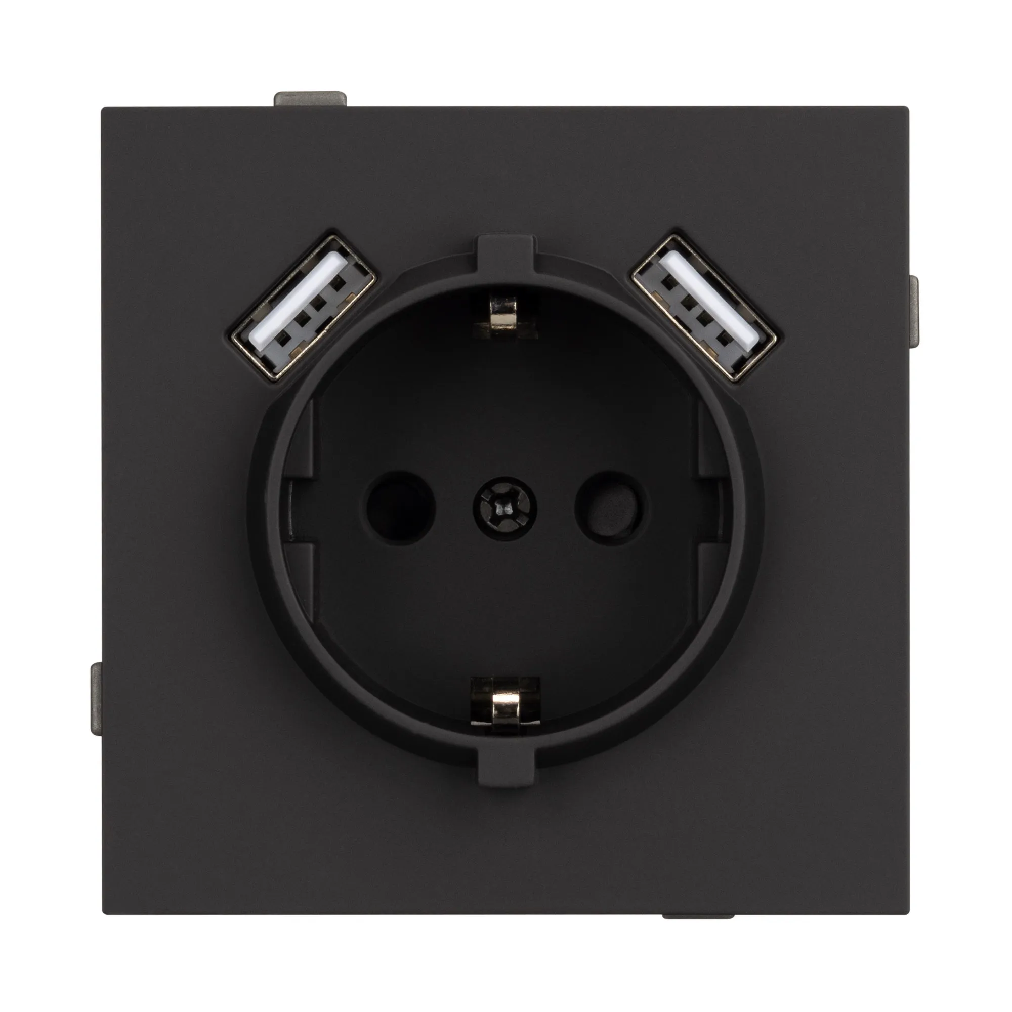 Механизм розетки с заземлением на 1 пост и 2USB Type A порта. Цвет - матовый черный, с Soft-Touch покрытием. Без фронтальной рамки. Уровень пылевлагозащиты IP20. Розетка устанавливается в стандартный подрозетник круглого сечения диаметром 60мм.