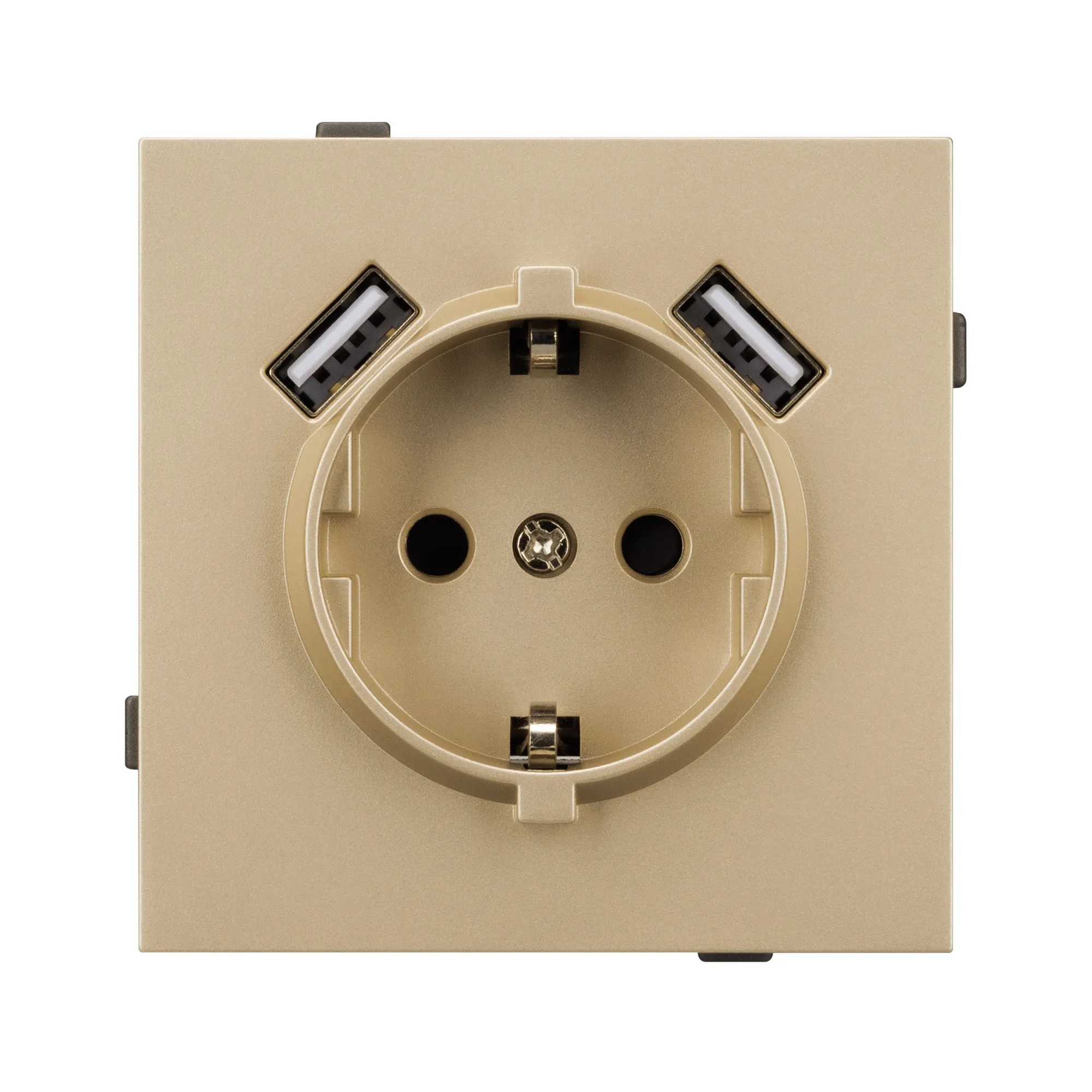 Механизм розетки с заземлением на 1 пост и 2USB Type A порта. Цвет - матовый песочный, с Soft-Touch покрытием. Без фронтальной рамки. Уровень пылевлагозащиты IP20. Розетка устанавливается в стандартный подрозетник круглого сечения диаметром 60мм.