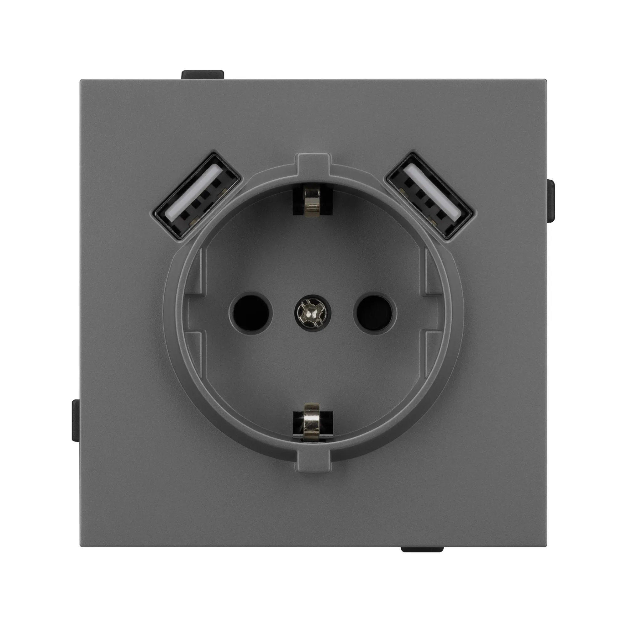 Механизм розетки с заземлением на 1 пост и 2USB Type A порта. Цвет - матовый графитовый, с Soft-Touch покрытием. Без фронтальной рамки. Уровень пылевлагозащиты IP20. Розетка устанавливается в стандартный подрозетник круглого сечения диаметром 60мм.