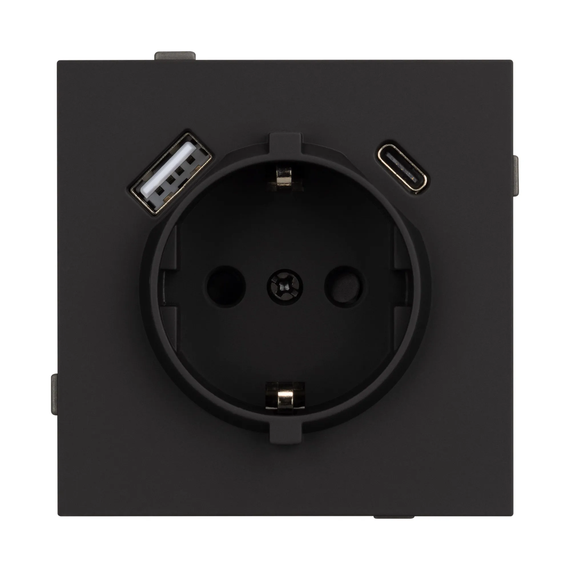 Механизм розетки с заземлением 1 пост 2 USB Type A+C порта. Цвет - матовый черный, с Soft-Touch покрытием. Без фронтальной рамки. Уровень пылевлагозащиты IP20. Розетка устанавливается в стандартный подрозетник круглого сечения диаметром 60мм.