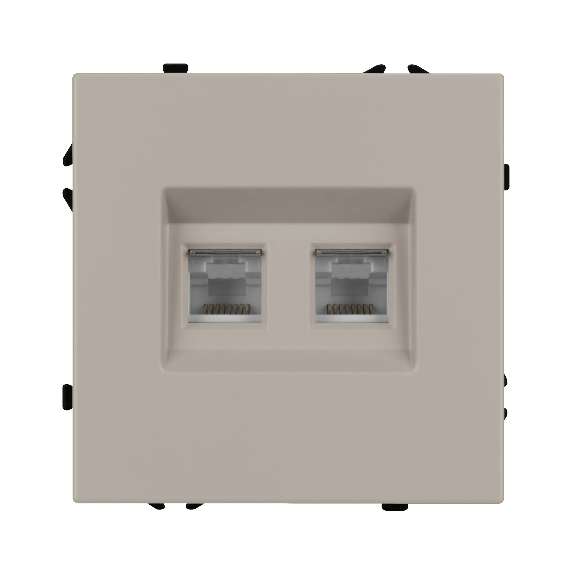 Механизм компьютерной розетки на 2 поста 6-й категории. Цвет - кашемир, с Soft-Touch поверхностью. Без фронтальной рамки. Уровень пылевлагозащиты IP20. Тип подключаемого разъема - RJ45. Розетка устанавливается в стандартный подрозетник круглого сечения диаметром 60мм.