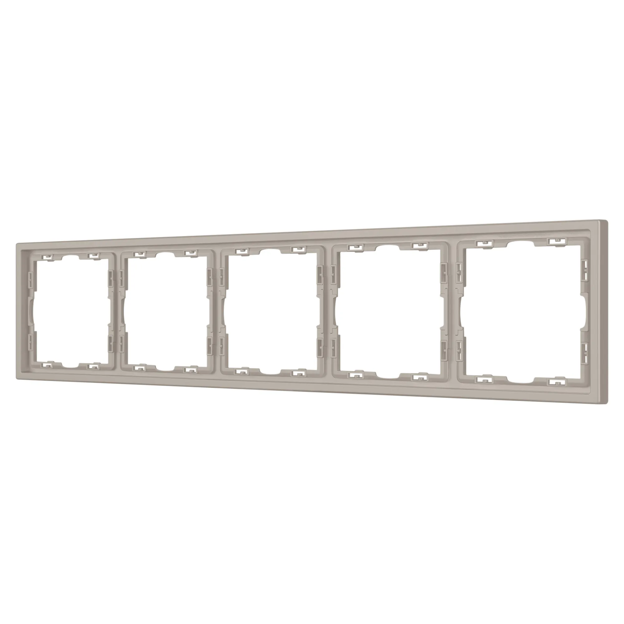 Рамка пластиковая на 5 постов, под встраиваемый механизм. Цвет - кашемир, с Soft-Touch поверхностью. Среднего уровня герметичности IP20. Ориентация монтажа горизонтальная.