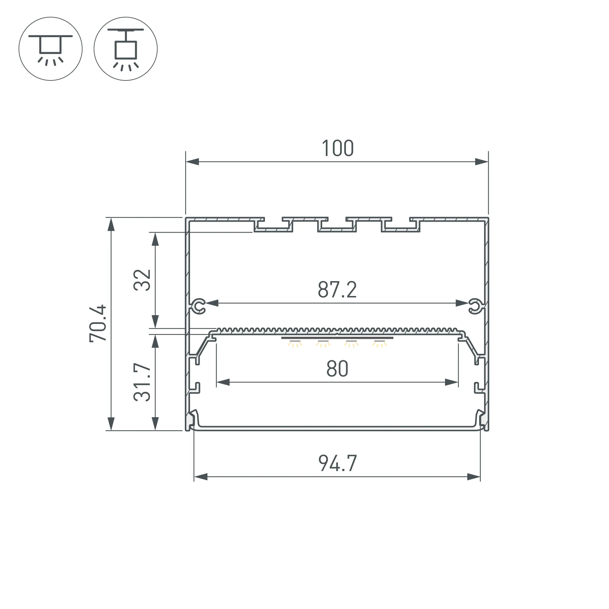 Алюминиевый анодированный профиль для светодиодных лент и линеек. Габаритные размеры (L×W×H): 2000x100x70,4 мм. Ширина площадки для ленты 80 мм. Размер отсека для блока питания: 87,2х32 мм. Экраны, заглушки и другие аксессуары приобретаются отдельно. Цена за 1 метр.