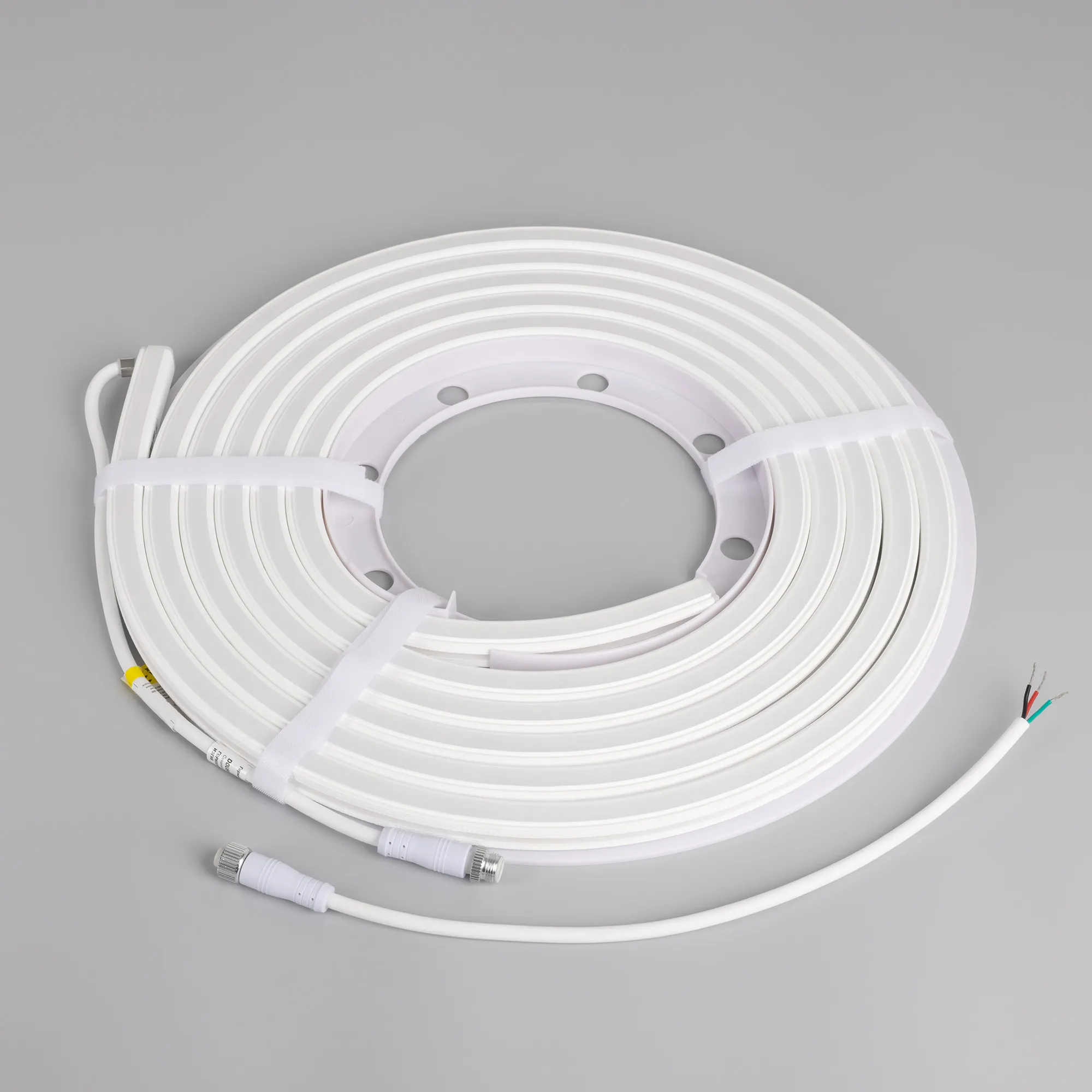 Гибкая герметичная лента (неон серии WAVE), сечение 16×15 мм. Светодиоды SMD2835 80 шт/м. Цвет свечения RGB, SPI (микросхема UCS1903, 10 пикселей/метр), угол излучения 292°. Мощность 12 Вт/м, питание 24 В. Класс пылевлагозащиты IP67. Размеры 5000×16×15 мм. Мин. отрезок 125 мм. Горизонтальный изгиб SIDE, свечение в две стороны, минимальный радиус изгиба 100 мм. Вывод кабеля с одной стороны перпендикулярно линии сечения неона. Катушка 5 м. Цена за 1 м. Гарантия 5 лет.