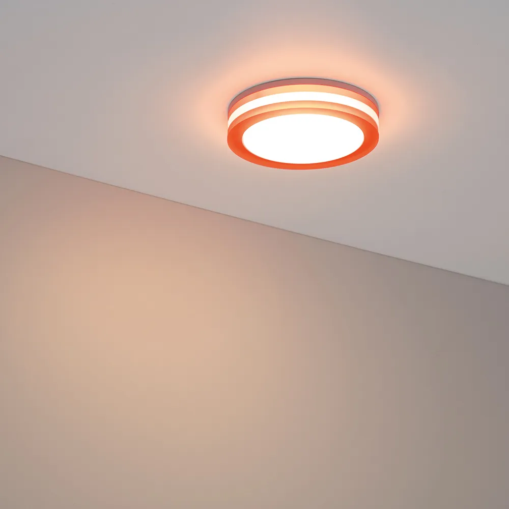 Круглый светильник с контурным свечением. Корпус белый с морковно-оранжевым + вставка поликарбонат PC. Цвет БЕЛЫЙ ДНЕВНОЙ 4000К, св.поток 400 лм, угол 120°+180°. Питание 110-240VAC, 5Вт, 300mA 15-18V, драйвер в комплекте. Размеры 80х40 мм, установка в отв.65 мм, высота мин.40 мм.